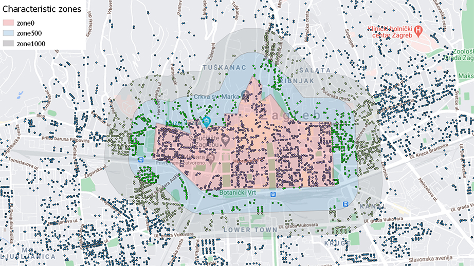 All this affects the prices of real estate in the city centre, which fell by approximately 10% in May and June from the same period of the year before (Figure 3). It should be noted that the total number of transactions in the identified area of the city centre and downtown Zagreb with a high density of buildings damaged in the earthquake (zone0 in Figure 5) was very small and thus has no big impact on aggregate price developments on the entire Zagreb level, which, as at June, showed a further increase in prices. To examine the possible indirect effects of the earthquake on other parts of the town, in which March earthquake damages are not so densely distributed, price indices were constructed for real estate in two additional characteristic city zones. Zone one, in addition to real estate in the central part of the town, includes all other real estate within a 500 meter distance from the central part of the town (zone500 in Figure 5). Zone two is similarly defined; it includes real estate within a 1000 meter distance (zone1000 in Figure 5). The indices show a smaller fall in prices with increasing distance from the zone with the highest density of damages from the earthquake, so for instance the prices of real estate within by 1000 meters from the zone that was hardest hit do not fall but rise.