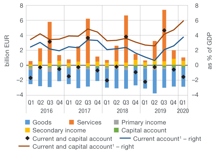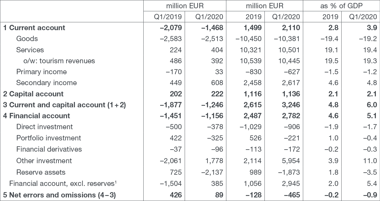 The current and capital account of the balance of payments ran a deficit of EUR 1.2bn in the first quarter of 2020, which is an improvement in the balance of EUR 0.6bn from the same period of the previous year. This was almost equally due to the improvement in the balance in the primary income account, increase in net services exports and a growth in total surplus in the secondary income and capital transaction accounts, while the contribution of developments in foreign trade in goods, although also favourable, was somewhat smaller. If the last four quarters are observed, the surplus in the current and capital account stood at 6.0% of GDP, having risen further from the entire 2019 when it stood at 4.8% of GDP.