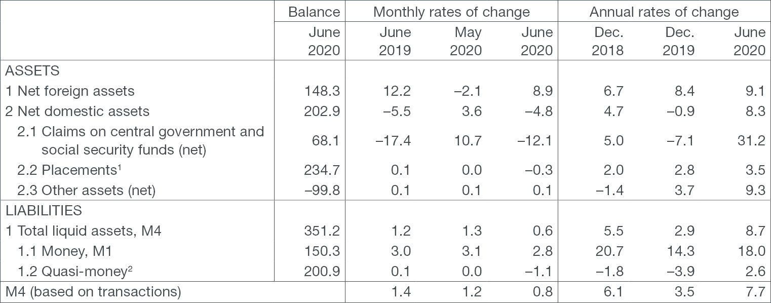 At the end of June, total liquid assets (M4) stood at HRK 351.2bn, up by HRK 2.0bn or 0.6% from the end of the previous month (Table 1), and the growth in money (HRK 4.2bn) outstripped the decrease in quasi-money. Moderate growth in M4 was driven by a strong growth in net foreign assets (NFA) of the monetary system and a concurrent sharp decrease in net domestic assets (NDA). Lower NDA level resulted from a drop in net claims on the central government, i.e. an increase in central government deposits with the CNB, deriving mainly from the depositing of EUR 2.0bn worth of funds generated by an eleven-year eurobond issue in the international capital market in mid-June. Following the sale of foreign exchange to the CNB by the Ministry of Finance early in June (EUR 0.3bn) and again in mid-June (EUR 1.2bn) due to the bond issue, the CNB's NFA rose sharply and the government deposited the funds raised through the sale of foreign exchange in the kuna account with the CNB. After five months of uninterrupted growth, M4 slowed down to 7.7% on an annual basis (transaction-based) in June (Figure 1). The annual growth of money (M1) edged down and stood at 18.0% at the end of June, while the annual growth rate of quasi-money halved to 1.0% due mostly to the slowdown in the growth of foreign currency deposits (transaction-based).