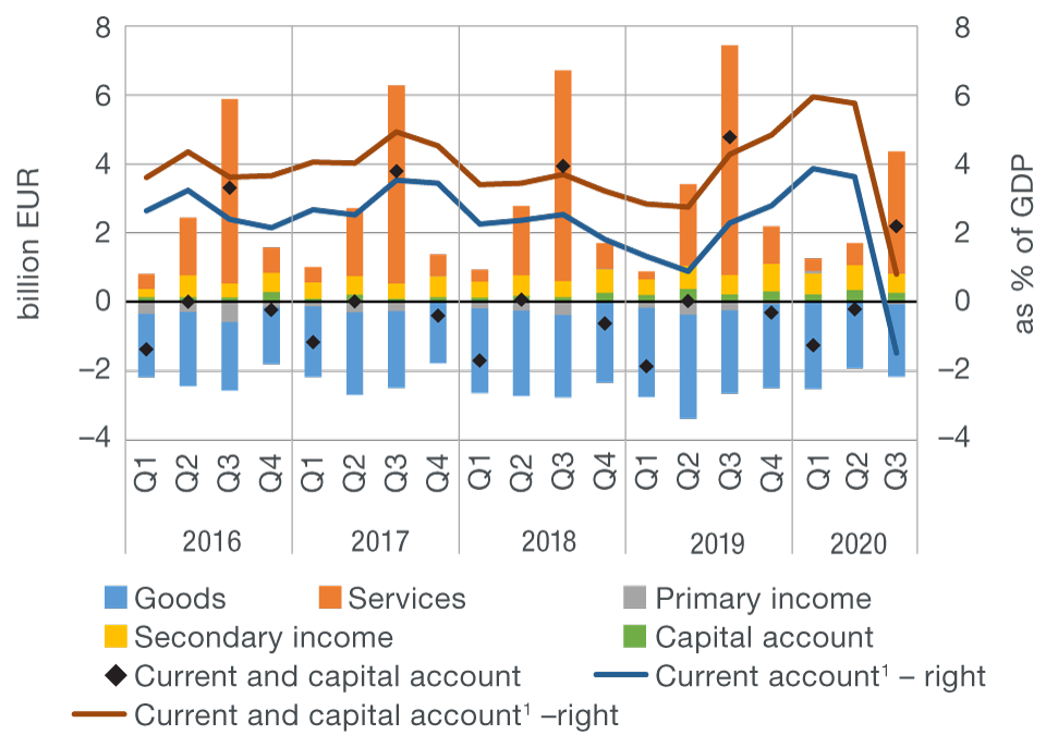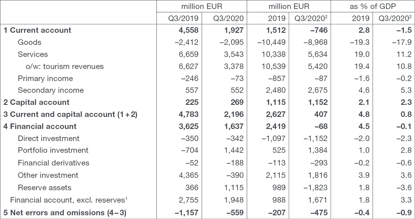 in the third quarter 2020, which was a deterioration of EUR 2.6 bn from the same period of the previous year. If the last four quarters are observed, the surplus in the current and capital account in the period up to the end of September 2020 totalled 0.8% of GDP, which was a decrease of 4.0 percentage points from the entire 2019.