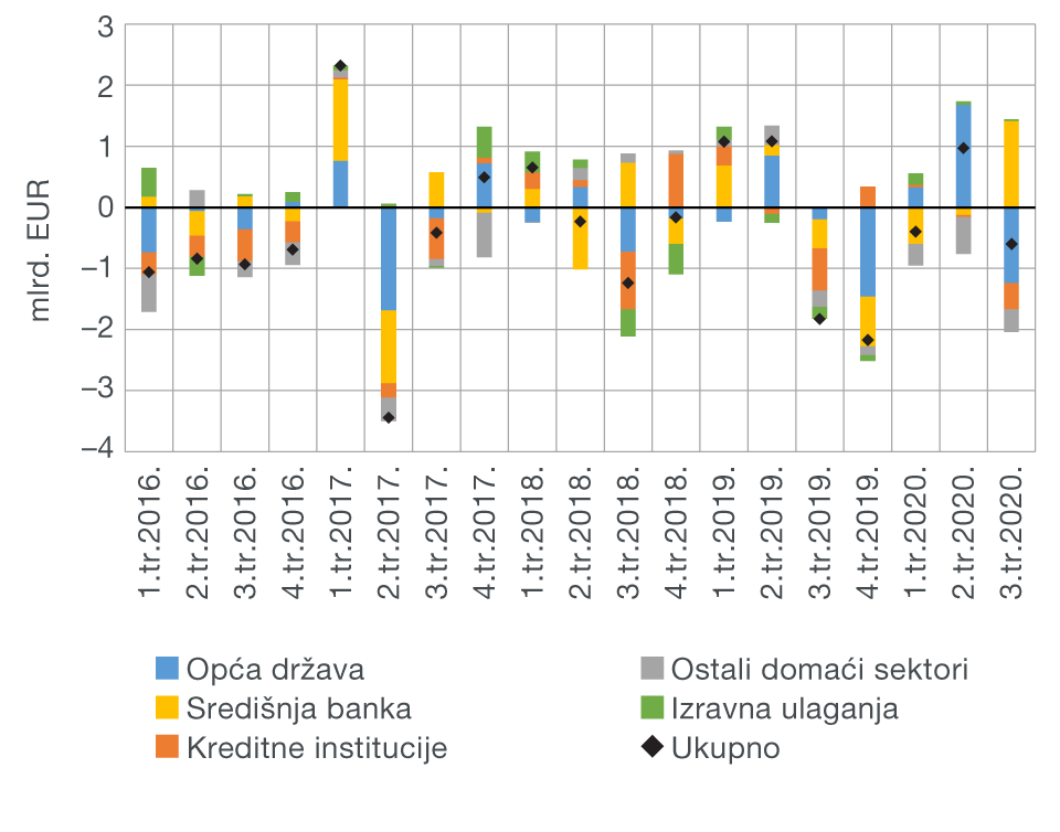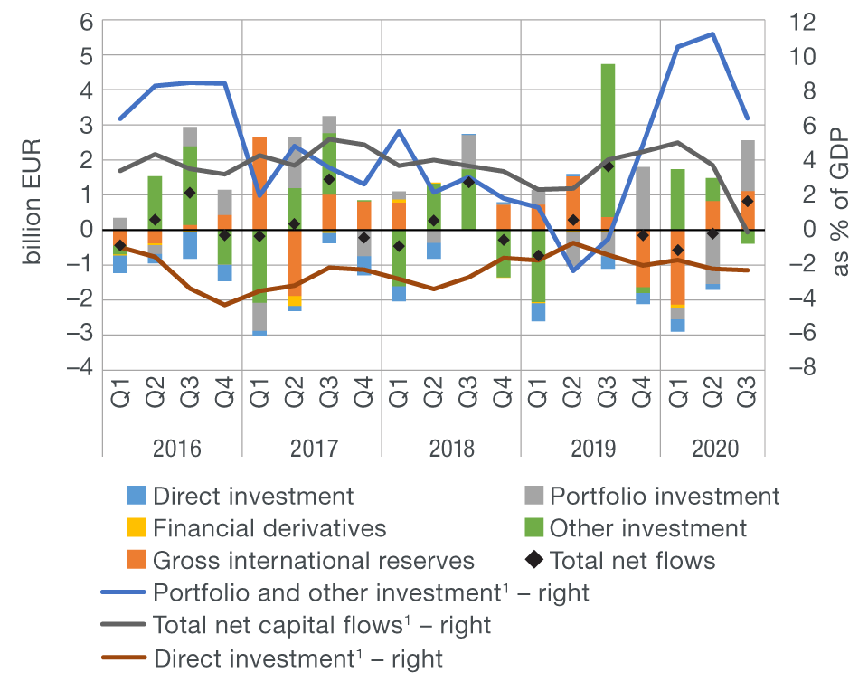 The financial account of the balance of payments recorded a net capital outflow of EUR 1.6bn in the third quarter of 2020, which is a decrease of EUR 2.0bn from zthe same period of the previous year (Figure 1b). The considerable decrease in net outflow reflects the earlier described deterioration of developments in the current and capital account. Broken down by individual accounts, a considerable net capital outflow was recorded in the portfolio investment account (EUR 1.4bn), while, on the other side, net capital inflow was recorded in the other investment account (EUR 0.4bn) and in the foreign direct investment account (EUR 0.3bn). At the same time, gross international reserves increased noticeably (EUR 1.1bn), almost reaching the level from the end of 2019 by the end of September. However, such developments were strongly influenced by the increase in the volume of repo agreements of the central bank abroad which raised the gross international reserves and liabilities of the central bank in the other investment account by EUR 1.4bn.