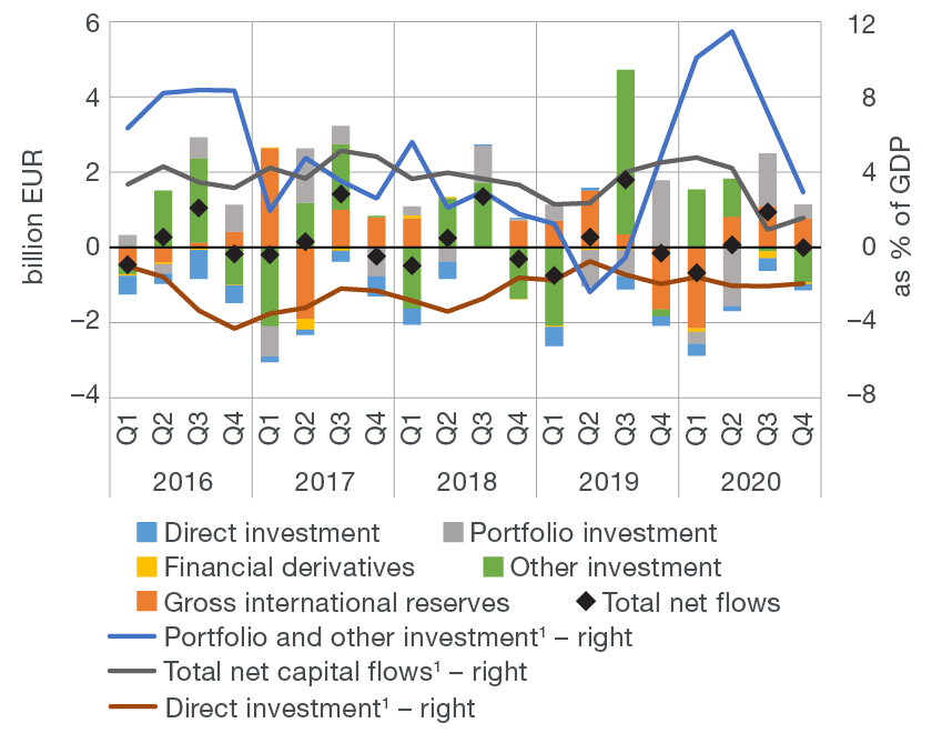 The financial account of the balance of payments recorded a marginal net capital outflow of EUR 24.8m in the fourth quarter of 2020 (Figure 1b). More specifically, the net capital outflow resulting from an increase in gross international reserves and a decrease in net liabilities on the portfolio investment account was almost completely offset by net capital inflows in the other investment account and the foreign direct investment account.