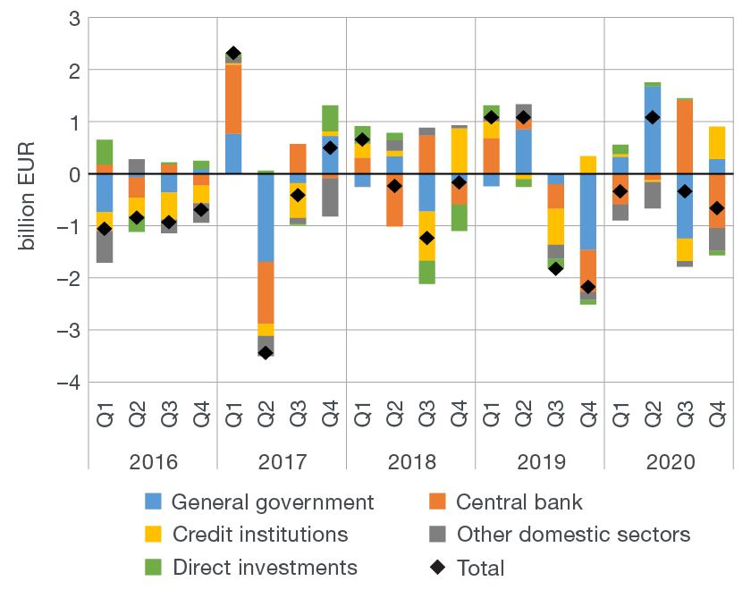 The net capital outflow in the portfolio investment account (of EUR 0.4bn) was primarily a consequence of asset growth triggered by investments of institutional investors in foreign shares and equity holdings, while the strong net capital inflow in the other investment account (of EUR 0.9bn) was mostly driven by the large seasonal decrease in net foreign assets of credit institutions. Government liabilities also increased, though to a much lesser extent, as a consequence of the long-term loan through the European instrument for temporary Support to mitigate Unemployment Risks in an Emergency (SURE). By contrast, net liabilities of other domestic sectors decreased, with the particularly strong decrease recorded in central bank liabilities being the result of the smaller volume of repo transactions, which have a neutral impact on the overall financial account balance.[2]