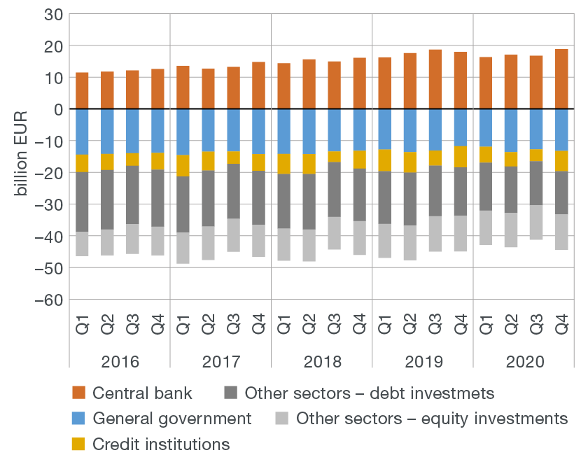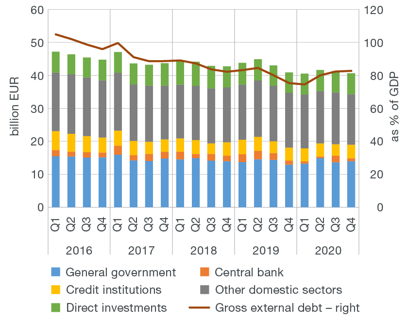 Gross external debt decreased by EUR 0.7bn in the fourth quarter of 2020 (Figure 2a). The debt of the central bank dropped the most (by EUR 1.0bn) due to the said decrease in the volume of repo transactions. Other domestic sectors, in particular private non-financial corporations, also reduced their debt, including liabilities to affiliated creditors (by EUR 0.5bn). By contrast, an increase was seen in debt of credit institutions (of EUR 0.6bn) and the government (of EUR 0.3bn), due to the borrowing under the SURE instrument. Accordingly, total gross external debt stood at EUR 40.6bn at the end of 2020, i.e. at 82.7% of GDP, which was, due to the fall in nominal GDP, 0.4 percentage points more than at the end of September (Figure 2b).