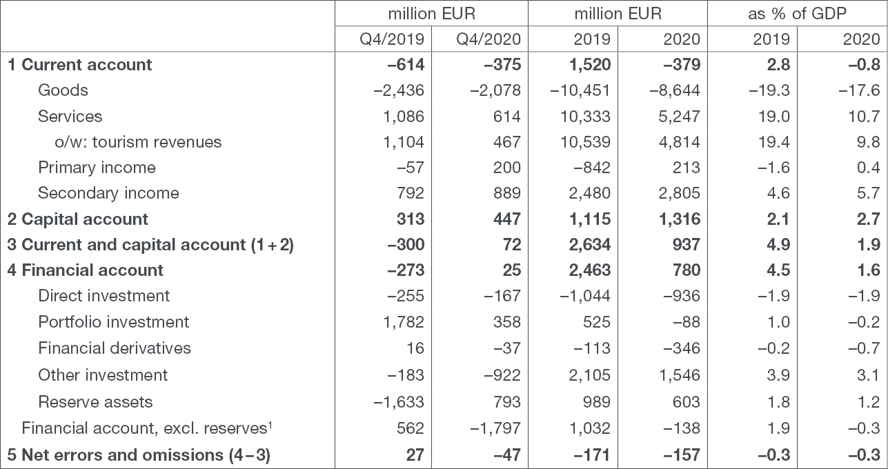 The current and capital account of the balance of payments accrued a surplus of EUR 0.1bn in the fourth quarter of 2020, which was an improvement of EUR 0.4bn from the same period of the previous year. On the 2020 level, as a result of the sharp fall in revenues from tourism consumption of foreign guests, the surplus in the current and capital account decreased by 2.9 percentage points of GDP from 2019, to 1.9% of GDP.