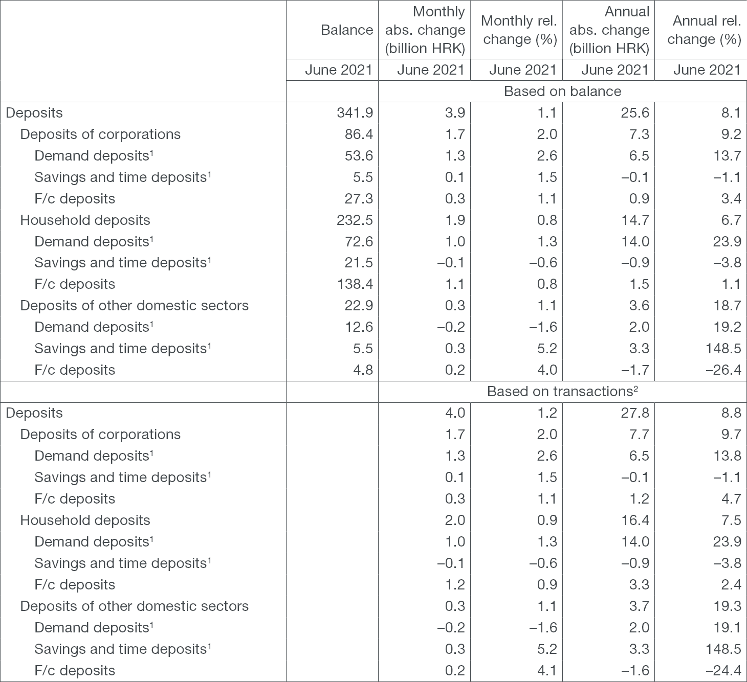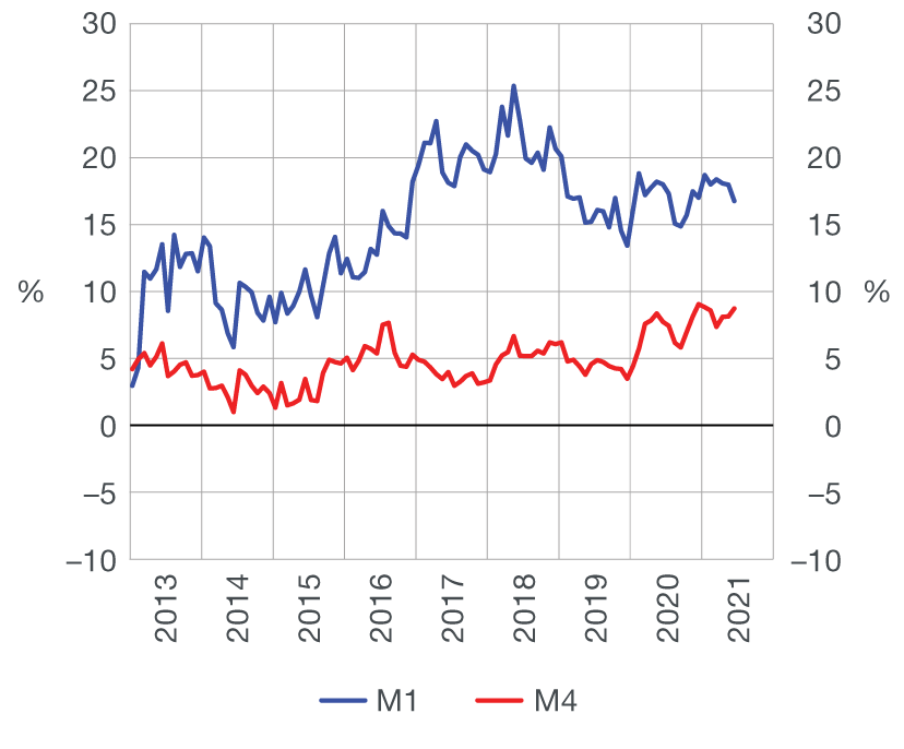 Total liquid assets (M4[1]) grew by HRK 5.0bn in June (1.3%, based on transactions) owing to the strong rise in net foreign assets (NFA) of the CNB and, to a smaller extent, the growth in net domestic assets (NDA) of the monetary system (Table 1). The growth in the NFA of the CNB was driven by the rise in bank funds in TARGET2 and the purchases of foreign exchange from banks and the government. The simultaneous growth in the NDA came mainly as a result of larger claims on the central government and households. As regards the components of M4, money (M1[2]) went up by HRK 3.1bn or 1.8% from May, due mostly to the rise in corporate and household demand deposits. The quasi-money also increased, in large part due to the rise in foreign currency deposits of households (Table 3). On an annual level, the growth rate of M1 decelerated from 18.0% in May to 16.8% in June, due to the base effect of stronger increase in M1 in June 2020, while M4 picked up in the same period, from 8.1% to 8.7%, mostly fuelled by the strong growth in foreign currency deposits in June 2021 (based on transactions, Figure 1).