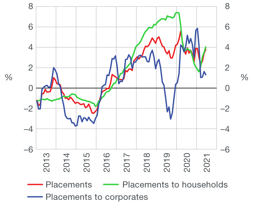 Total placements of monetary institutions to domestic sectors picked up in June, on the back of an increase in household loans, mostly driven by the new round of the government's housing loans subsidy programme, and a rise in placements to the central government. In contrast, placements to corporates and other financial institutions decreased.