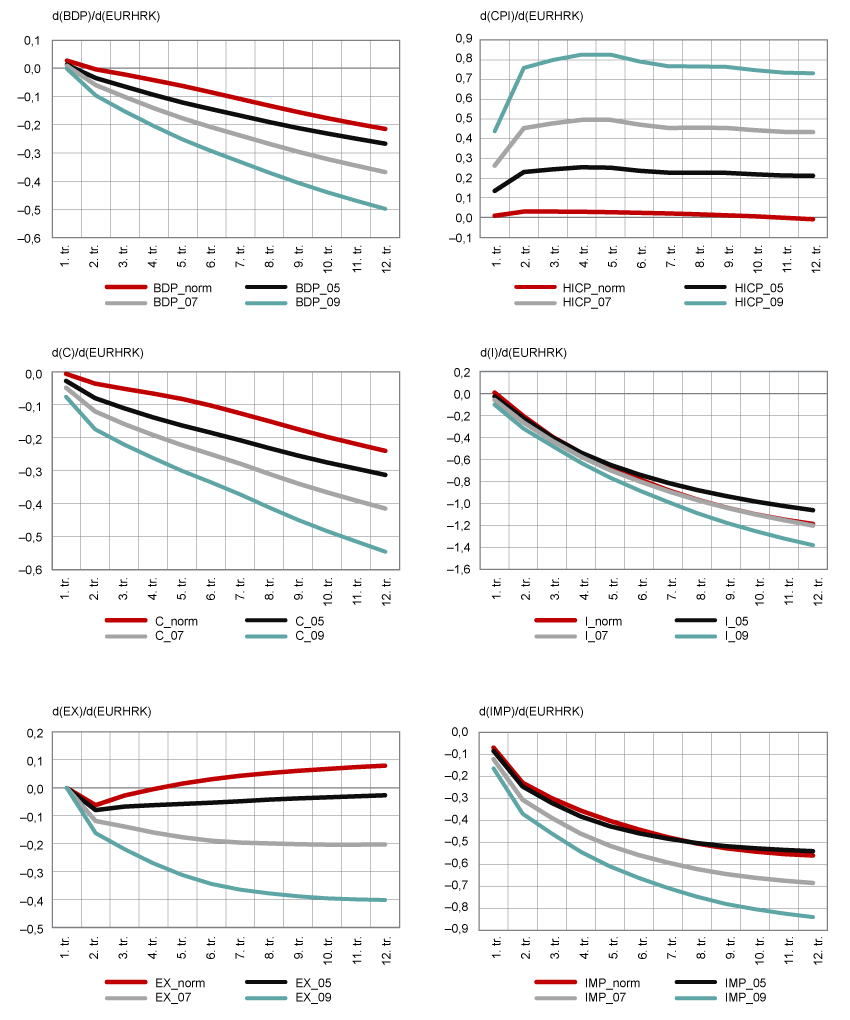 Napomena: Elastičnost je omjer funkcije impulsnog odaziva endogene varijable i promjene tečaja. Nastavak normal označava scenarij malih tečajnih promjena (<4%), a nastavci 05, 07 i 09 označavaju scenarije većih promjena tečaja parametrom prijenosa od 0,5, 0,7 i 0,9.