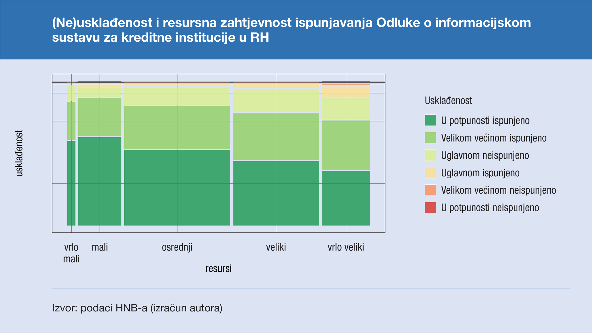 Ovaj rad istražuje podržavaju li empirijski podaci pretpostavku postojanja povezanosti između resursne zahtjevnosti ispunjavanja odredaba i kršenja tih odredaba. Istraživanjem su prikupljeni (cenzus) podaci o resursnoj zahtjevnosti postizanja i održavanja usklađenosti sa svim odredbama "Odluke o primjerenom upravljanju informacijskim sustavom" (Odluke o IS-u) te o razini usklađenosti svake kreditne institucije u Republici Hrvatskoj sa svakom odredbom Odluke o IS-u. Empirijski podaci prikupljeni su 2021. godine pisanim upitnicima: upitnik o resursnoj zahtjevnosti postizanja i održavanja usklađenosti upućen je svim kreditnim institucijama, a upitnik o usklađenosti upućen je ovlaštenim vanjskim revizorima kreditnih institucija.