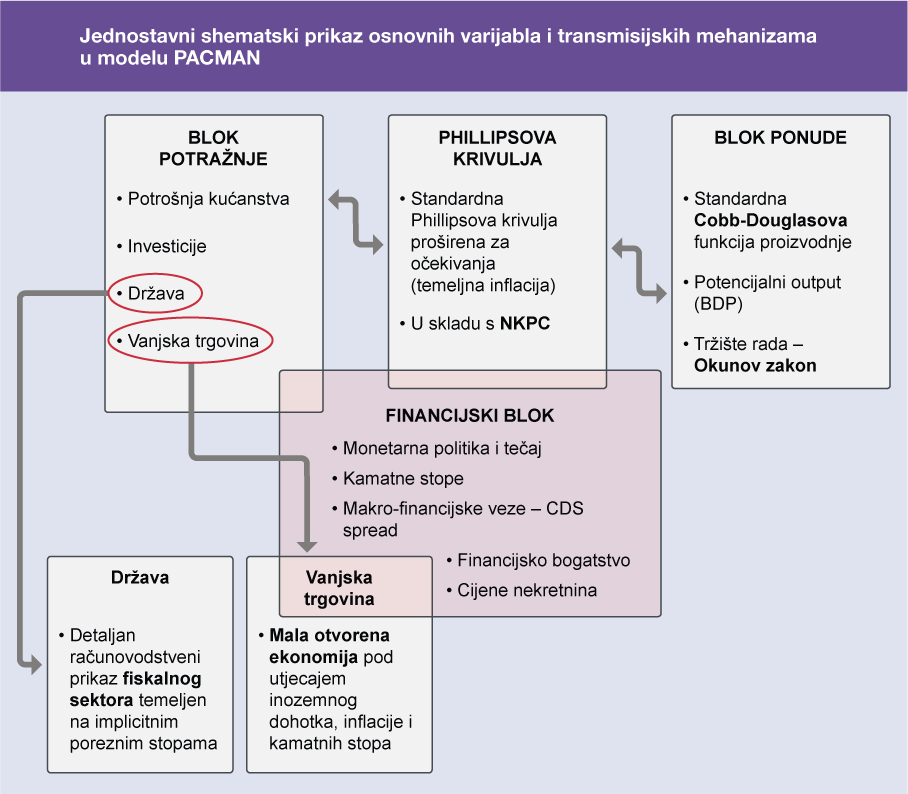 PACMAN je najnovija verzija polustrukturnog makromodela Hrvatske koji služi kao jedan od alata HNB-a pri: a) prognoziranju, b) analizi scenarija uključujući testiranja otpornosti kreditnih institucija na stres (engl. stress test) i c) simulacijama učinaka ekonomskih politika. Osnovne jednadžbe modela utemeljene su na ekonomskoj teoriji, ali su modificirane kako bi bolje odgovarale stvarnim podacima. Zbog svoje teoretske dosljednosti i brojnih transmisijskih kanala PACMAN omogućuje narativno objašnjenje uzroka i posljedica brojnih gospodarskih kretanja.