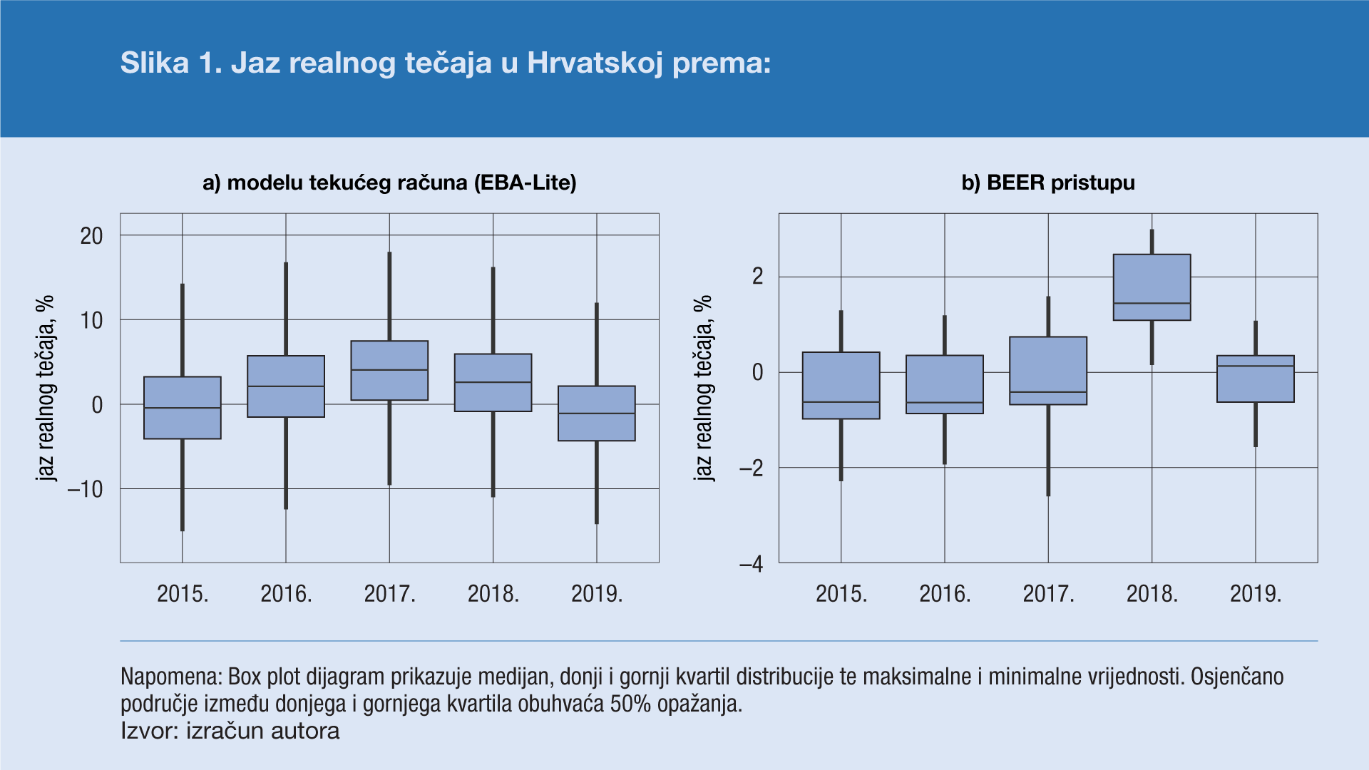 Jaz realnog tečaja izračunat na osnovi dvaju objašnjenih metodoloških pristupa prikazan je na Slici 1. u obliku tzv. box plot dijagrama. Jaz na slici lijevo zasniva se na istoj odabranoj specifikaciji procijenjenoga regresijskog modela, ali uz različite pretpostavke o prilagodbi tekućeg računa, elastičnostima uvoza i izvoza na promjene realnog tečaja te veličini jaza politika, dok se desna slika zasniva na 16 različitih ekonometrijskih specifikacija modela.
