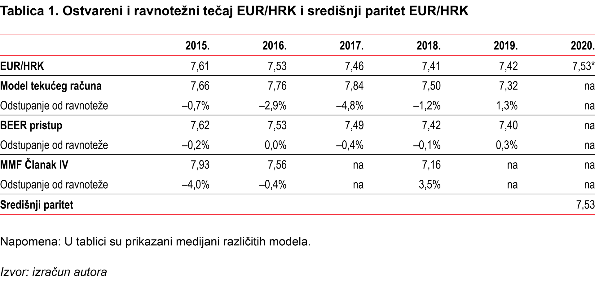 Središnji paritet po kojemu je kuna pridružena tečajnom mehanizmu ERM II (1 euro = 7,53450 kuna) određen je blago iznad ravnotežne razine nominalnog tečaja izračunatog za 2019. godinu na koji upućuju medijani modela tekućeg računa i BEER modela ocijenjenih u ovom radu. Međutim, s obzirom na uzlazne pritiske na tečaj EUR/HRK u 2020. godini zbog jednokratnih šokova izazvanih pandemijom koronavirusa na makroekonomska kretanja i platnu bilancu, može se pretpostaviti kako bi i ravnotežna razina tečaja u 2020. godini bila ocijenjena višom no u 2019. godini. U tom se kontekstu odabrani središnji paritet može smatrati adekvatnim.