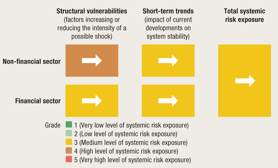 Total systemic risk exposure at the end of the fourth quarter of 2021 remained moderate (Figure 1). Economic activity recovered more rapidly and strongly than expected, so that businesses relied less on fiscal support. However, risks are still elevated due to uncertainties regarding the end of the pandemic, growing consumer price inflation, strong residential real estate price growth and increasing geopolitical risks. Therefore, the degree of exposure to systemic risks has remained unchanged for all sectors from the previous assessment (Macroprudential Diagnostics No. 15).