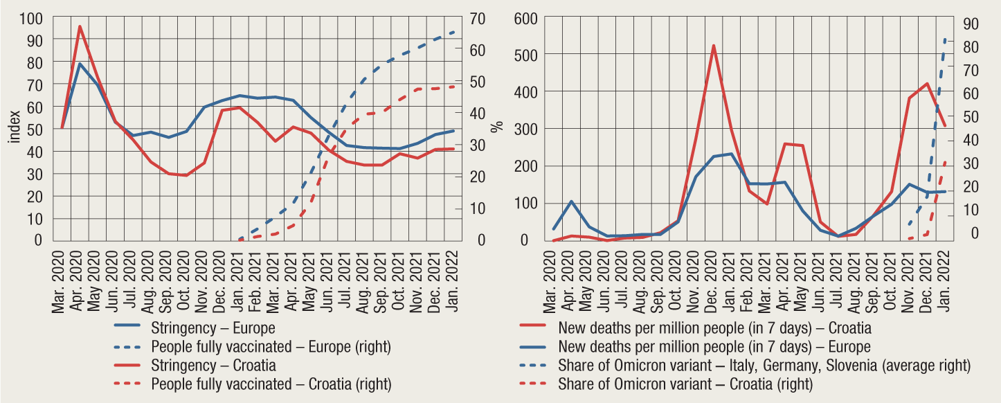 Figure 2 COVID-19 in Croatia and the EU: epidemiological stringency and vaccination rate (left panel) and deaths and Omicron variant share (right panel)