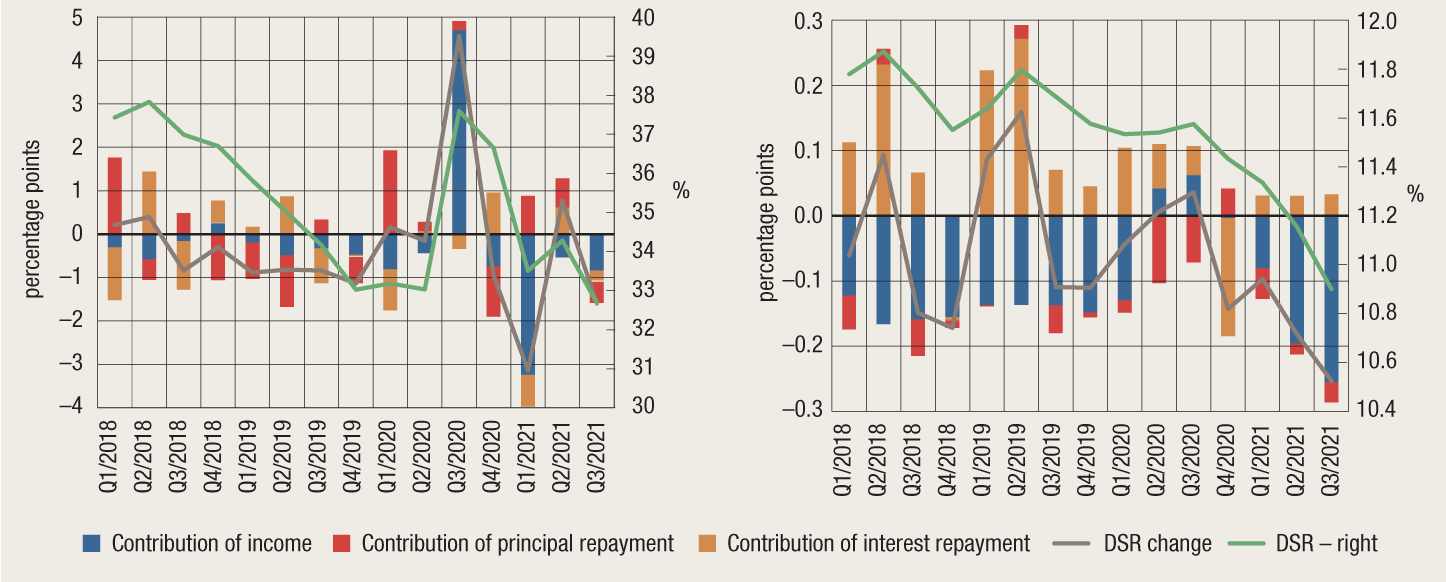 Figure 3 Debt service-to-income ratio developments in the corporate (left panel) and the household (right panel) sector
