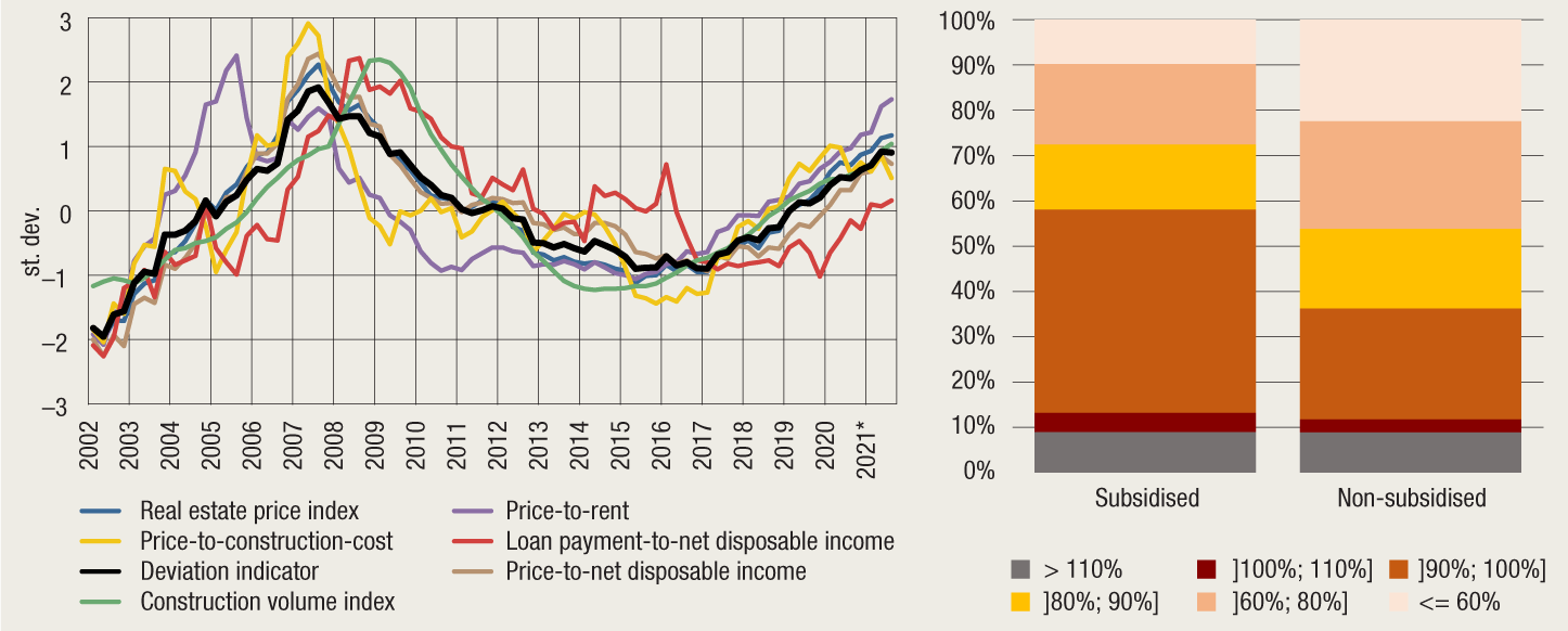 Figure 4 Deviation of the residential real estate market indicator from the long-term equilibrium (left panel) and the distribution of the principal in newly-granted housing loans according to classes of the loan-to-value ratio (LTV) (right panel)