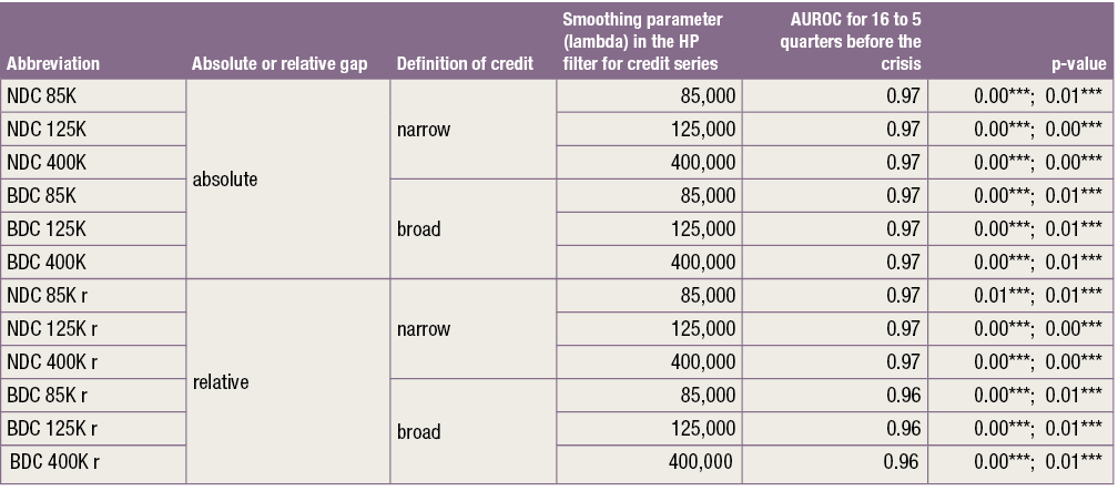 Notes: Each of the gaps in Table 1 has been obtained by special filtering applied to the credit series using smoothing parameters specified in the table, while the GDP series has been filtered using a parameter of 1,600. The p-value refers to the p-values of the DeLong one-sided test where the null hypothesis assumes that the selected indicator has a lower AUROC value than the Basel indicator (left) and the specific indicator applied thus far (right). ** and *** indicate significance of 1% and 5% respectively. The absolute gap is calculated as the difference between the credit ratio and its trend, while the relative gap is calculated as their ratio reduced by 1 and multiplied by 100%.