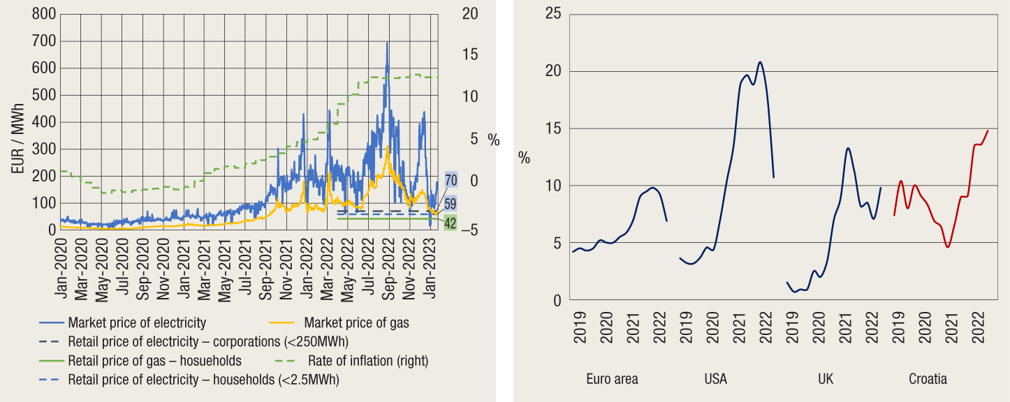The effects of heightened geopolitical uncertainty, economic slowdown and strong inflationary pressures that prompted monetary policy tightening gradually spilled over to the Croatian economy in the course of 2022. Even though consumer price inflation slowed down in December under the influence of a drop in energy and food prices on global markets to levels recorded in early 2022 (Figure 2), core inflation continued to grow, reaching a level twice as high as that recorded in the euro area. The fiscal position increased in the current year as a result of solid economic growth, higher price levels and the still relatively low interest rates. However, a possible prolongation of the broad-based fiscal support introduced with the aim of mitigating the consequences of inflation could strengthen the risk to public finance sustainability amid slower economic activity and increased borrowing costs.