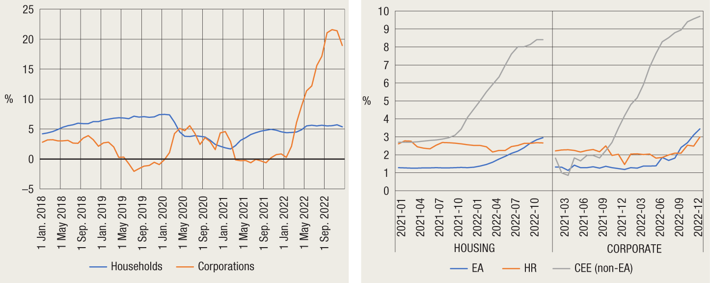 Interest rates on household loans could see a more noticeable increase in the course of the current year. Specifically, as of January 2023, a slight increase in interest rates has been observed in the offer of new residential loans of banks, with a lag still noticeable in the intensity of the increase compared with the rest of the euro area. Additional liquidity surpluses and low financing costs from deposits coupled with the hike in the ECB's key interest rates had a favourable effect on the profitability of credit institutions even without a significant rise in interest rates on loans. Furthermore, the intensity of the increase in interest rates on existing loans with variable interest rates has been dampened by legal restrictions on maximum interest rates.