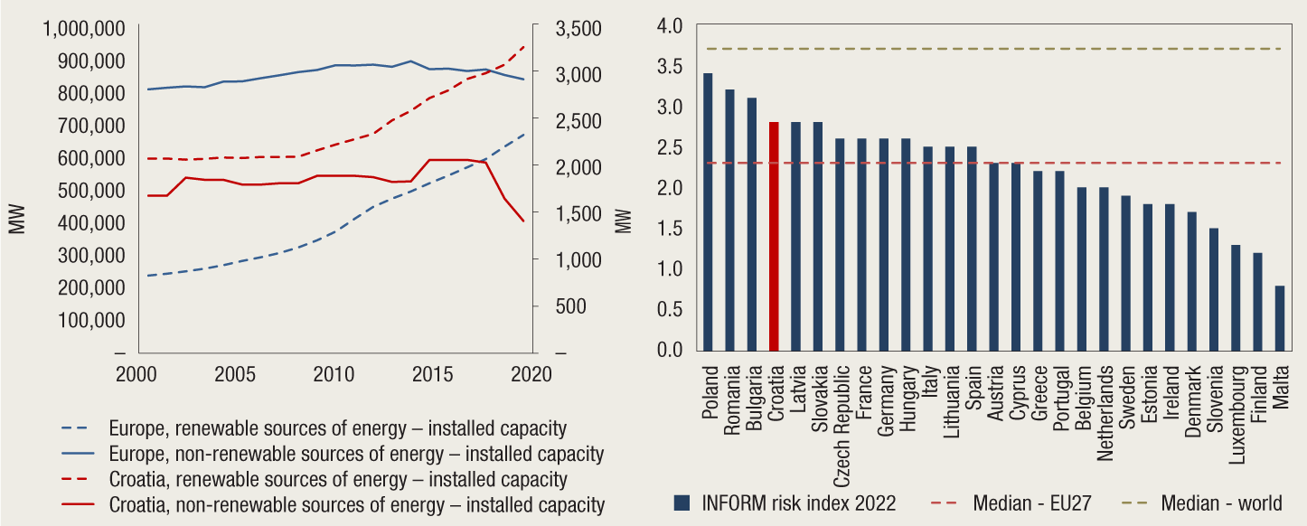 Notes: Installed capacity refers to the maximum net generating capacity of power plants in a given year. INFORM risk index represents the sensitivity of particular countries to human and natural disasters that may destabilise national civil protection capacities. The index encompasses three dimensions: hazard and exposure, vulnerability and lack of coping capacity; higher index values point to higher risk. The aggregate measure for the world and EU countries is calculated as the median of indices by countries. |