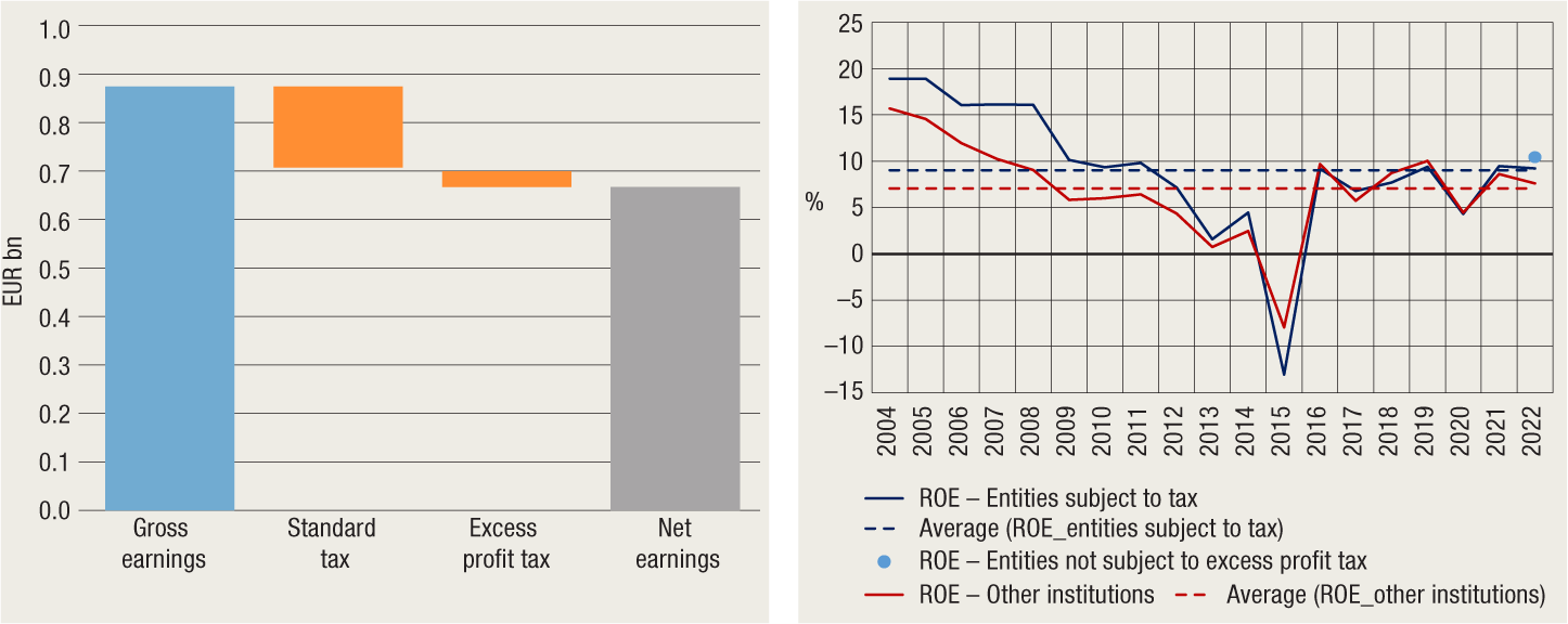 According to preliminary unaudited data, in 2022, banks operating in Croatia generated gross profits similar to those recorded in 2021, although in the first three quarters, their profits were 25% higher than in the same period in the year before. This will result in a financial obligation for banks to pay an amount slightly above EUR 150m under regular profit tax and some EUR 25m more based on excess profit tax (Figure 1). Only a small number of a total of eight larger banks will be subject to excess profit tax based on the income criterion. The excess profit tax will decrease the return on equity of banks subject to the tax by roughly one percentage point, reducing it to a level around its long-term average (Figure 2). Still, the ROE of such banks should still exceed that of banks that are not subject to the excess profit tax.