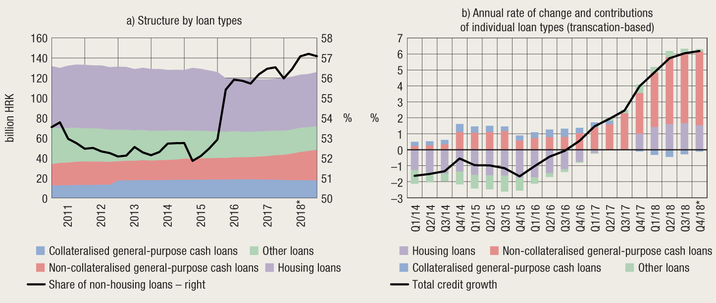 Furthermore, non-collateralised general-purpose cash loans are frequently granted within a very short period of time, sometimes without the client visiting the branch office, via mobile and online distribution channels. The simple manner in which such loans are granted, coupled with prolonged initial maturities and higher loan amounts, have increased the attractiveness of this form of borrowing. On the other hand, precisely due to the potentially higher degree of risk of such loans, credit institutions grant them with higher interest margins, enabling an immediate increase in profitability and the placement of surplus liquidity.