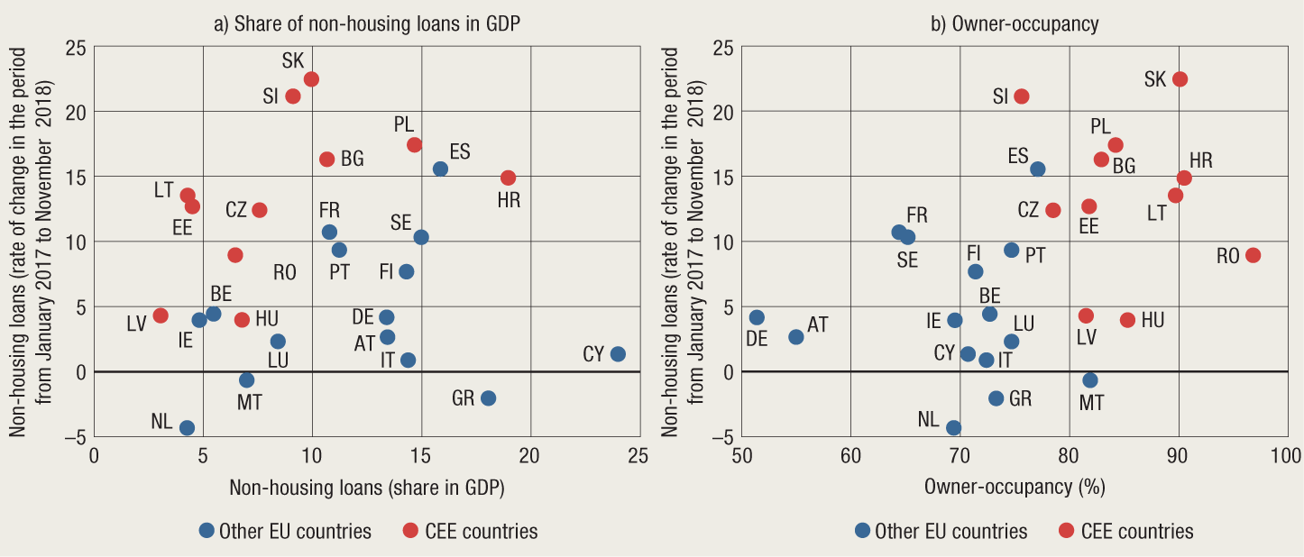 A significant rise in non-housing loans was seen not only in Croatia but also in other EU countries over the past few years, mainly in Central and East European, most notably Slovakia and Slovenia, but also in countries such as Spain, which had witnessed a long-standing drop in lending activity following the crisis (Figure 2.a). Interestingly, Croatia stands out among the mentioned countries with a somewhat higher share of non-housing loans (measured as the share in GDP) and a total amount of household loans transactions exceeding 1% of GDP annually. At the same time, these countries are characterised by the high share of owner-occupier households, which implies a smaller demand for housing loans (Figure 2.b). By contrast, total credit growth in western European countries was spurred mainly by the rise in housing loans, which also set the trends of total lending in euro area countries (see ECB box on consumer credit growth).