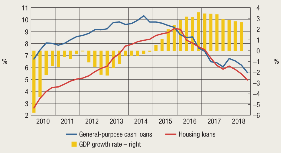 Cyclical vulnerabilities of the non-financial sector increased moderately (Figure 1, in the middle, above). Contributing to this was a notable acceleration of general-purpose cash lending of banks to the household sector, which in 2018 reached two-digit growth rates. General-purpose financing, predominantly non-collateralised, calls for special attention (see Box 1 Does intensified growth in general-purpose cash loans bring risks to financial stability?) because, stimulated by (excessively) eased credit standards, it may in the future, in particular in the downward phase of the economic cycle, lead to difficulties in household sector debt servicing and consequential losses for banks.