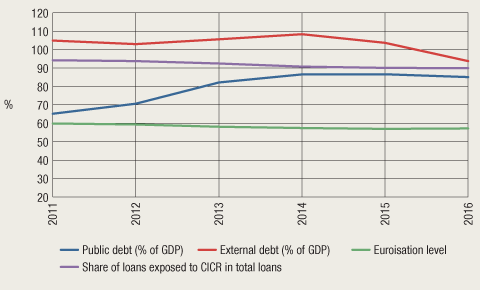 The gradual economic recovery reflected in higher actual and expected rates of economic growth and the decrease in budget deficit reduced the risks for the Croatian economy. Domestic vulnerabilities were further mitigated by the stabilisation of the increase in general government debt as a result of the somewhat stronger than expected consolidation of public finance achieved in 2016. Nevertheless, levels of external and public debt have remained high and still pose significant structural risks. At the same time, external vulnerabilities, although stabilised to some extent, have remained elevated, largely due to the high external debt-to-GDP ratio. Even though the share of external debt decreased in 2016, its level has remained high, making the country extremely vulnerable in the context of a possible change in financing conditions. On the other hand, the achieved current account surplus and the expectations of a continued positive balance contributed to the reduction of external imbalances.