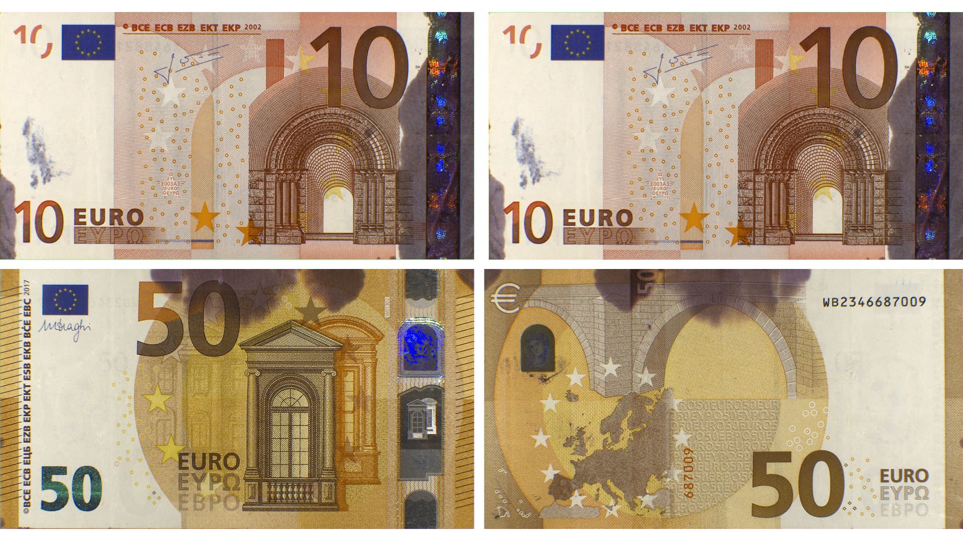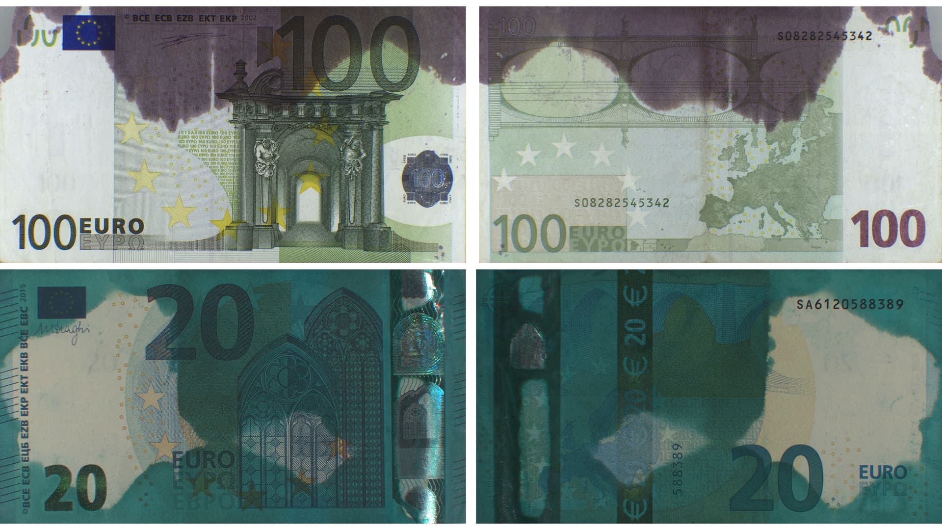 Do not accept stained euro banknotes that look like the banknotes in Figure 1 below because there is a high probability that they are stolen and stained by the activation of the anti-theft electrochemical protection system.