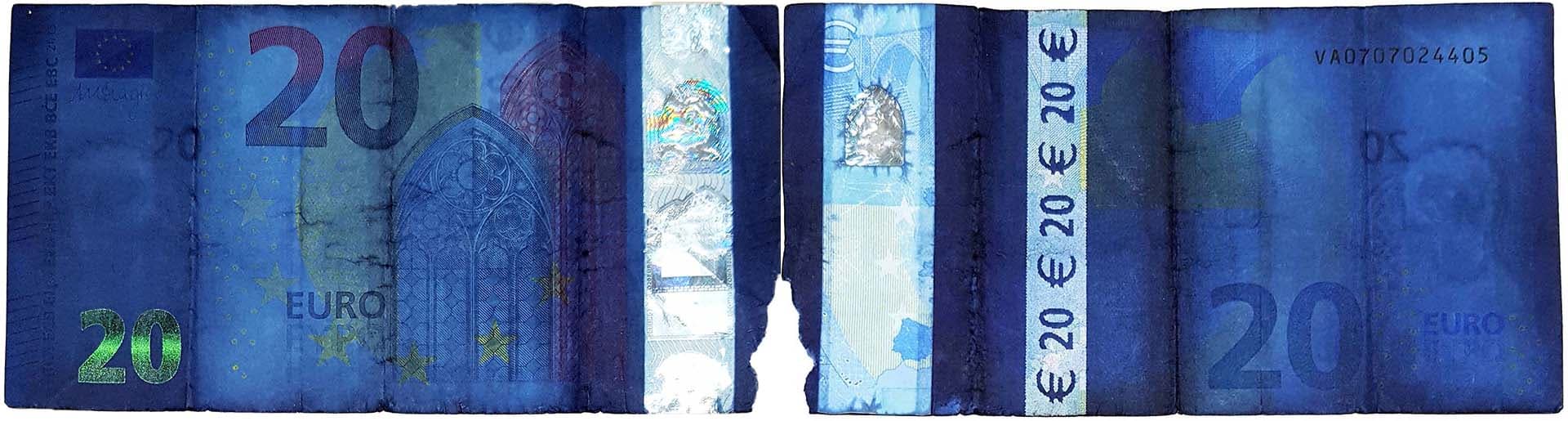 Sometimes, individuals try to remove the ink by washing the stained banknotes. As a result, the euro banknotes’ original colours could be altered and the banknotes’ security features may be damaged or even destroyed. Often the hologram is also removed from the banknote when it is exposed to a specific solvent.