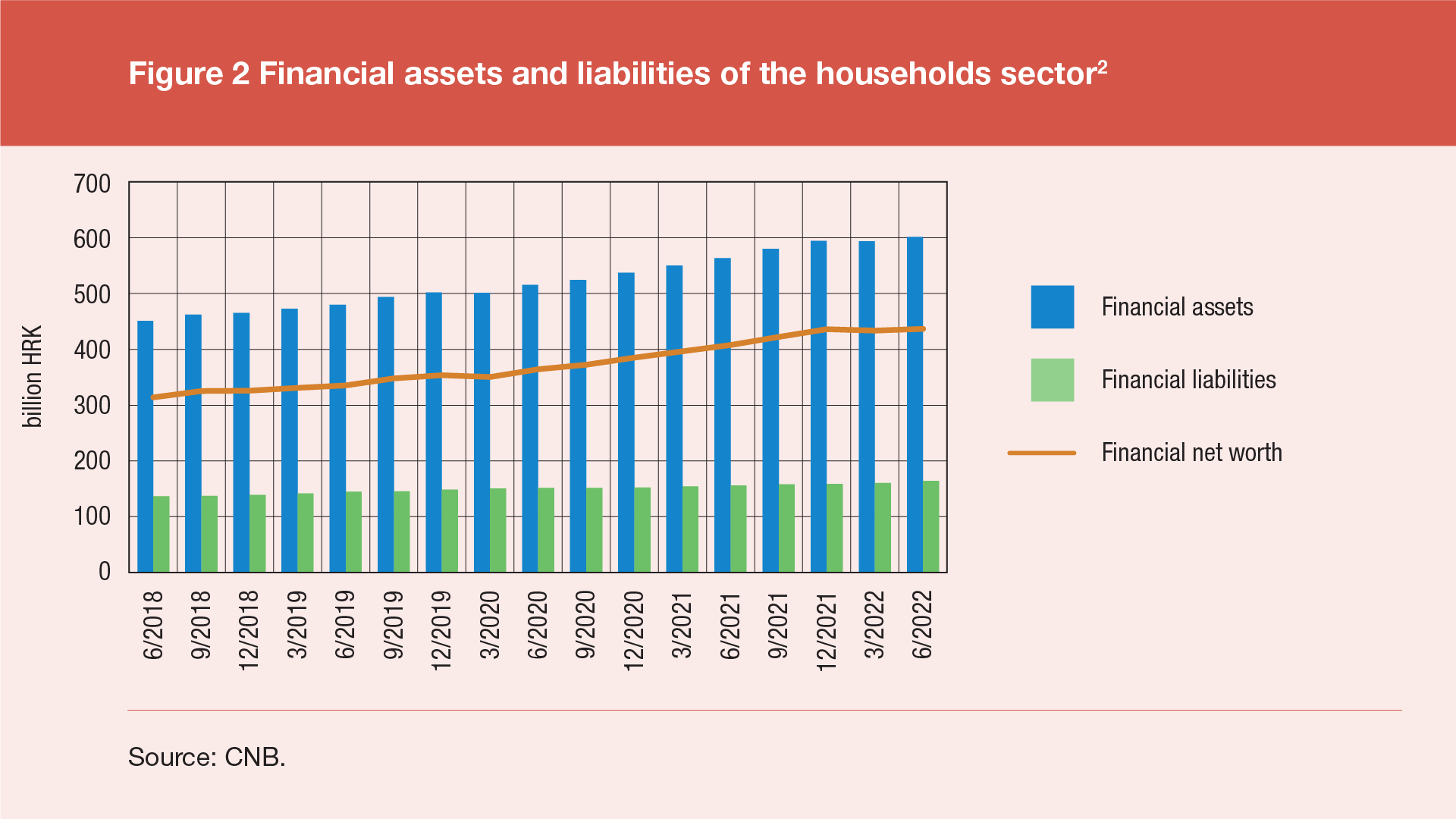The total financial assets of households stood at HRK 601bn at the end of the second quarter of 2022 (Figure 2), which is an increase of 1.2% from the end of the previous quarter. In the period of one year, the financial assets of households increased by HRK 37.7bn. The financial liabilities of households increased to HRK 164bn or 2.4% more than at the end of the previous quarter. As a result, the financial net worth of the household sector amounted to HRK 437bn or 0.8% more than at the end of the previous quarter, and thus the net worth of this sector, showing a trend of accelerated growth since the second quarter of 2020, has increased again following its decrease in the previous quarter. Over a longer period of time, net worth of the household sector increased by HRK 29.1bn in the period of one year.