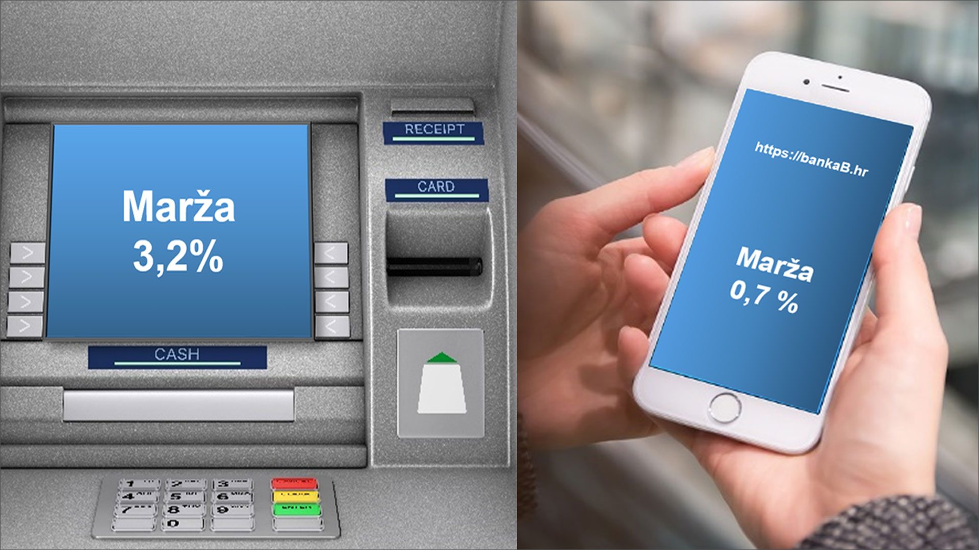 Slika 1. Usporedba informacije o marži na zaslonu bankomata (koju daje pružatelj DCC usluge) s informacijom koju banka koja je izdala platnu karticu objavljuje na svojoj internetskoj stranici (slika i primjer teksta su simbolični)