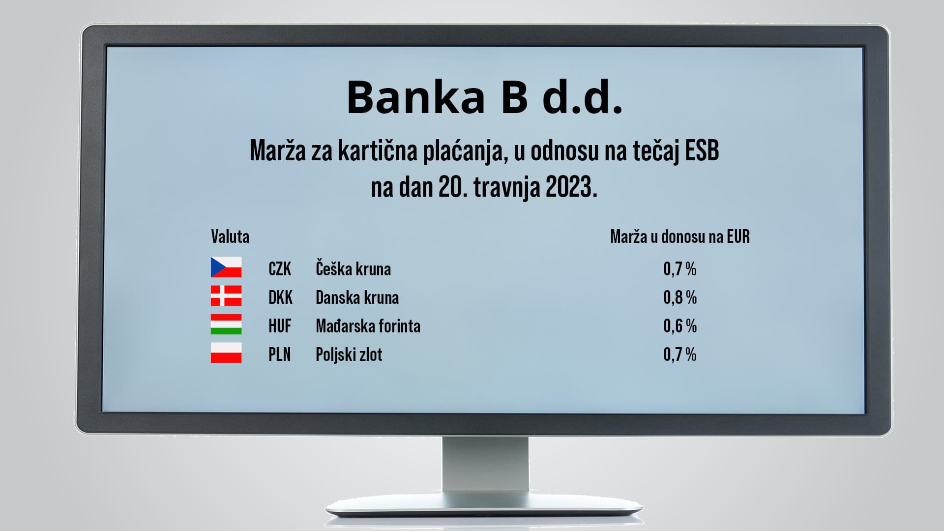 Iz tog razloga, banka koja je izdala platnu karticu dužna je informaciju o svojoj ukupnoj naknadi, za preračunavanje valuta iskazanoj kao postotna marža u odnosu na posljednje referentne devizne tečajeve Europske središnje banke za euro, priopćiti korisniku kartice prije izvršenja platne transakcije. To će banka osigurati navođenjem informacije u okvirnom ugovoru (općim uvjetima), te na razumljiv i lako dostupan način na svojim internetskim stranicama, internetskom bankarstvu i aplikaciji za mobilno bankarstvo.