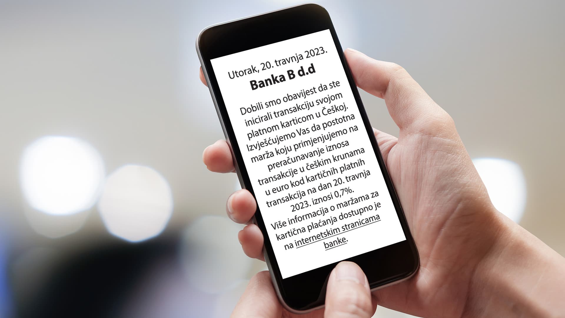 Slika 3. Informacija o postotnoj marži za kartična plaćanja koju banka dostavlja SMS-om (slika i primjer teksta simbolični su)