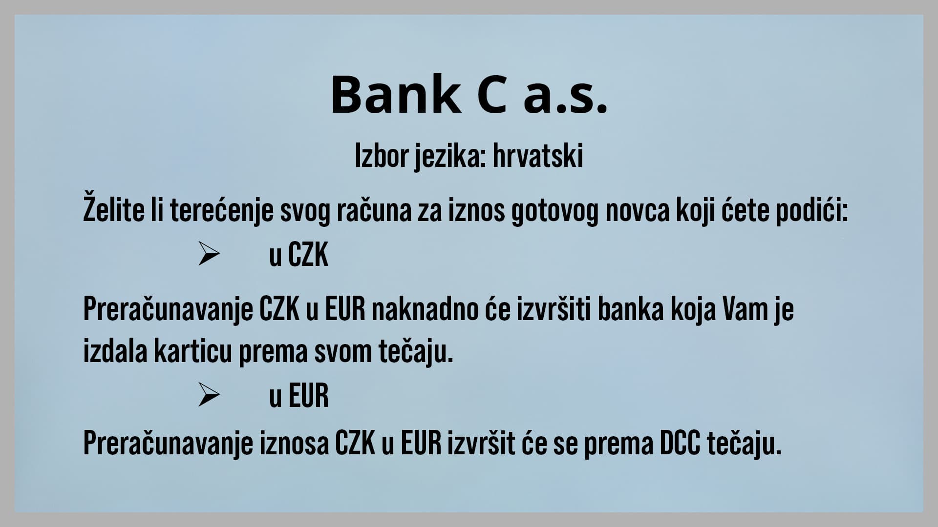 Podizanje gotovog novca debitnom karticom izdanom u RH na bankomatu u Češkoj (slika i primjer teksta simbolični su)