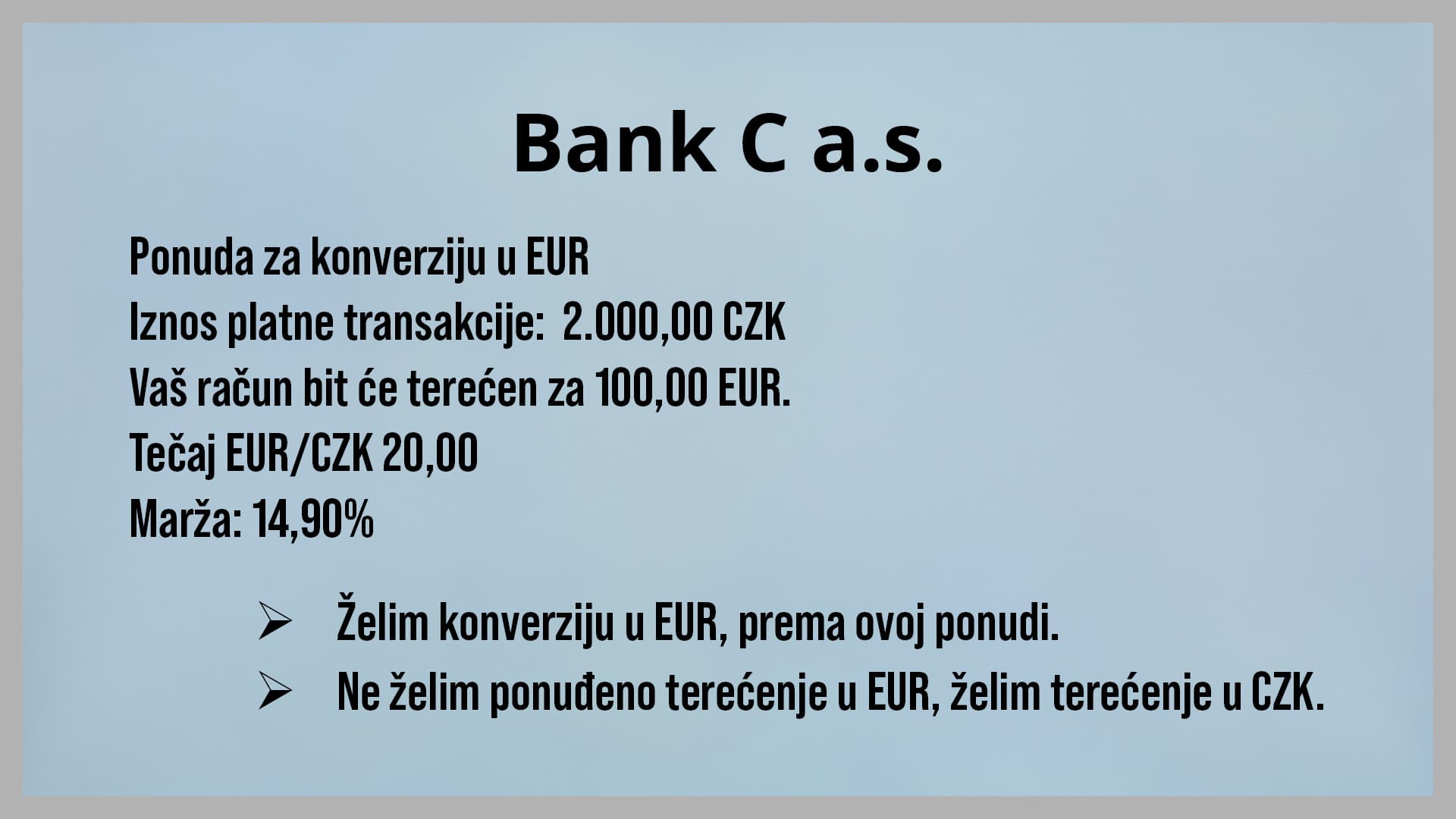 Kod obje mogućnosti, s obzirom na to da je valuta transakcije različita od njegove domicilne valute, potrebno je izvršiti uslugu preračunavanja valuta.