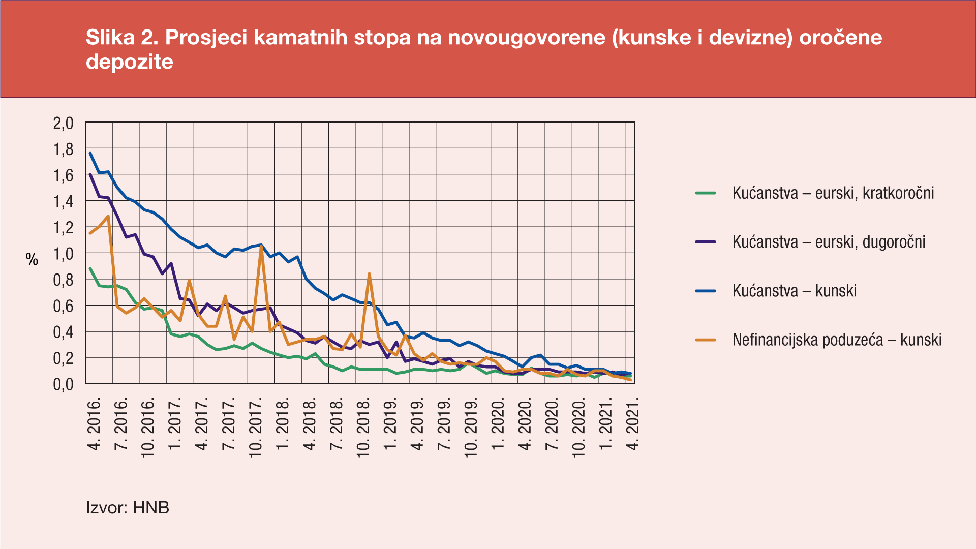 Kod oročenih (kunskih i deviznih) depozita u travnju 2021. godine prosjeci kamatnih stopa za kunske depozite bili su znatno manji nego u istom mjesecu prethodne godine (za 0,05 postotnih bodova kod kućanstava i za 0,08 postotnih bodova kod nefinancijskih poduzeća), a za devizne depozite u eurima isti ili neznatno manji nego u travnju 2020. godine (za 0,01 postotni bod manji za kratki rok, a isti za dugi rok). U travnju 2021. godine prosjek kamatnih stopa za oročene kunske depozite kućanstava iznosio je 0,08%, jednako kao i za dugoročno oročene eurske depozite kućanstava. Najniži je bio prosjek kamatnih stopa za oročene kunske depozite nefinancijskih poduzeća (0,03%).