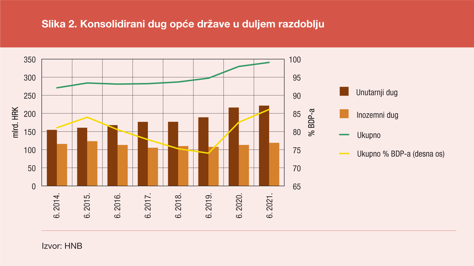 According to final data, the total consolidated debt of all general government sub-sectors[1] reached HRK 340.8bn at the end of June 2021, up by HRK 0.3bn (or 0.1%) since the end of March 2021 and up by HRK 11.0bn (or 3.4%) since the end of June 2020. The annual debt growth was due to an increase in the domestic debt by HRK 5.2bn (or 2.4%) and in the external debt by HRK 5.9bn (or 5.2%). Domestic debt grew by HRK 2.7bn (or 1.2%), while external debt shrunk by HRK 2.4bn (or 2%) from the last quarter.