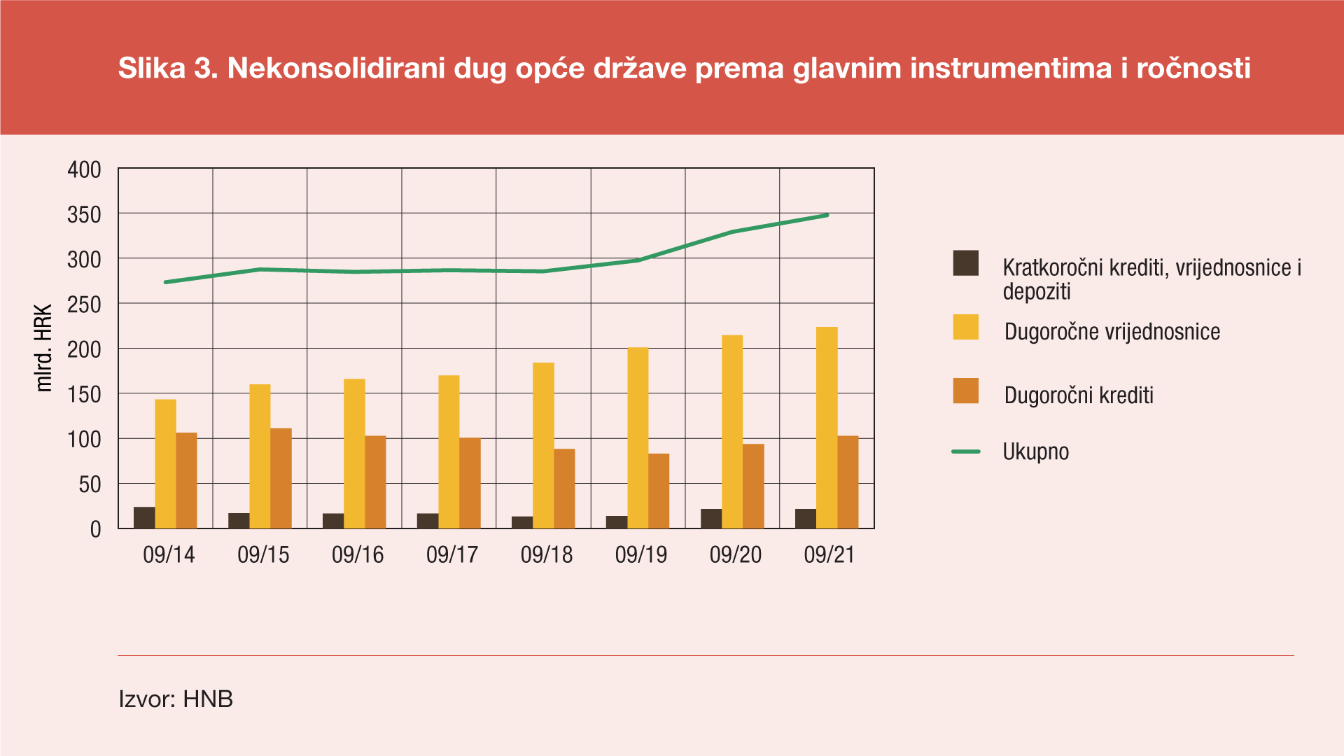 Prema konačnim podacima ukupno stanje konsolidiranog duga svih podsektora opće države[1] na kraju rujna 2021. godine iznosilo je 344,7 milijardi kuna, pa je u odnosu na kraj lipnja 2021. ostvaren rast od 3,9 milijardi kuna (ili 1,1%), a u odnosu na kraj rujna 2020. taj je dug veći za 18,7 milijardi kuna (ili 5,7%). Ovaj prirast duga na godišnjoj razini uzrokovan je porastom unutarnjeg duga za 7,9 milijardi kuna (ili 3,6%) te inozemnog duga za 10,8 milijardi kuna (ili 10,2%). U odnosu na prethodno tromjesečje za unutarnji dug bilježi se rast od 6,3 milijarde kuna (ili 2,9%), a za inozemni dug pad od 2,5 milijardi kuna (ili 2,1%).
