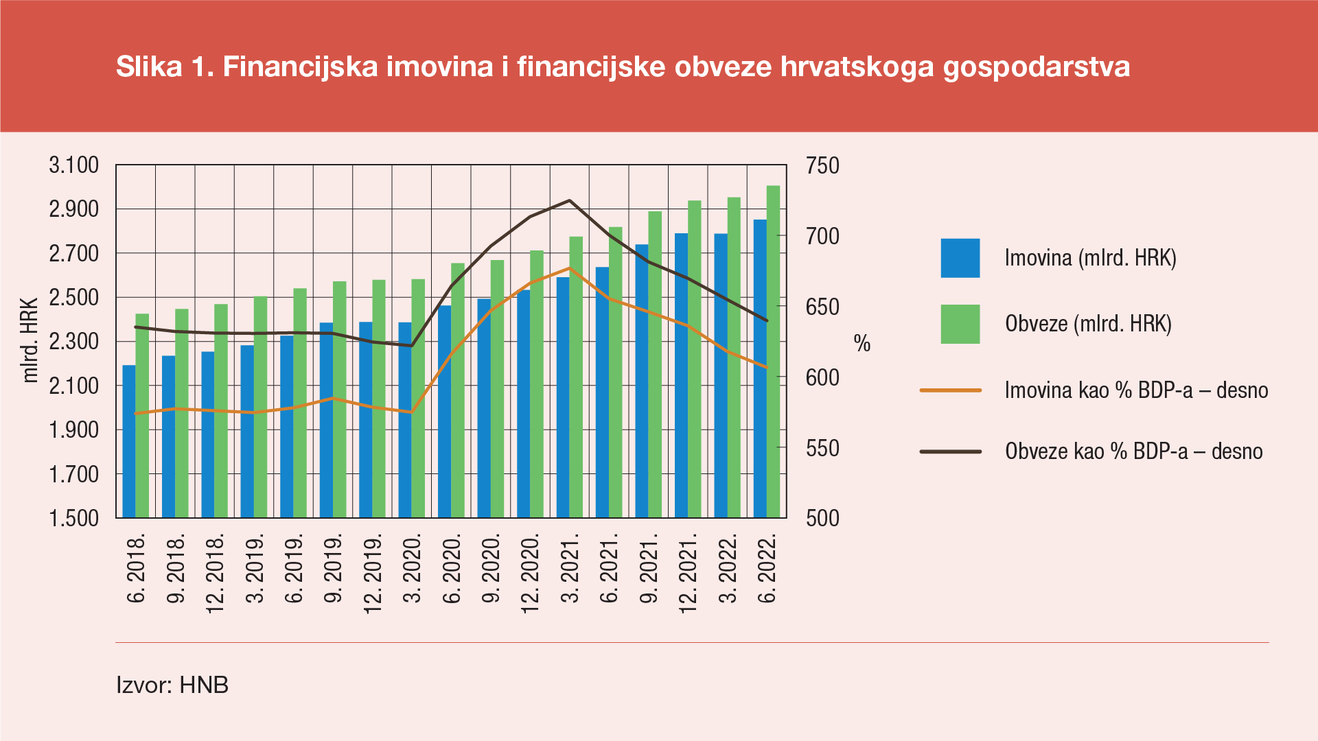 Na kraju drugog tromjesečja 2022. (Slika 1.) financijska imovina hrvatskoga gospodarstva iznosila je 2.851 mlrd. HRK, što je povećanje od 63,6 mlrd. HRK u tom tromjesečju i povećanje od 214,3 mlrd. HRK u razdoblju od godine dana. Istodobno, financijske obveze hrvatskoga gospodarstva iznosile su 3.005 mlrd. HRK, a povećale su se za 53,1 mlrd. HRK u tromjesečju odnosno 187,4 mlrd. HRK u razdoblju od godine dana. U odnosu na BDP financijska imovina hrvatskoga gospodarstva na kraju drugog tromjesečja 2022. iznosila je 607% godišnjeg BDP-a, što je smanjenje od 11,2 postotna boda u tom tromjesečju i smanjenje od 48,5 postotnih bodova u razdoblju od godinu dana. Istodobno, financijske obveze hrvatskoga gospodarstva smanjile su se za 14,9 postotnih bodova u tromjesečju i za 60,7 postotnih bodova u godinu dana te su na kraju drugog tromjesečja 2022. dosegnule razinu od 640% godišnjeg BDP-a. Time je nastavljeno smanjivanje stanja imovine i obveza hrvatskoga gospodarstva u odnosu na BDP, koje je započelo u drugom tromjesečju 2021. godine zahvaljujući sporijem rastu njihove vrijednosti u odnosu na rast tromjesečnog BDP-a.