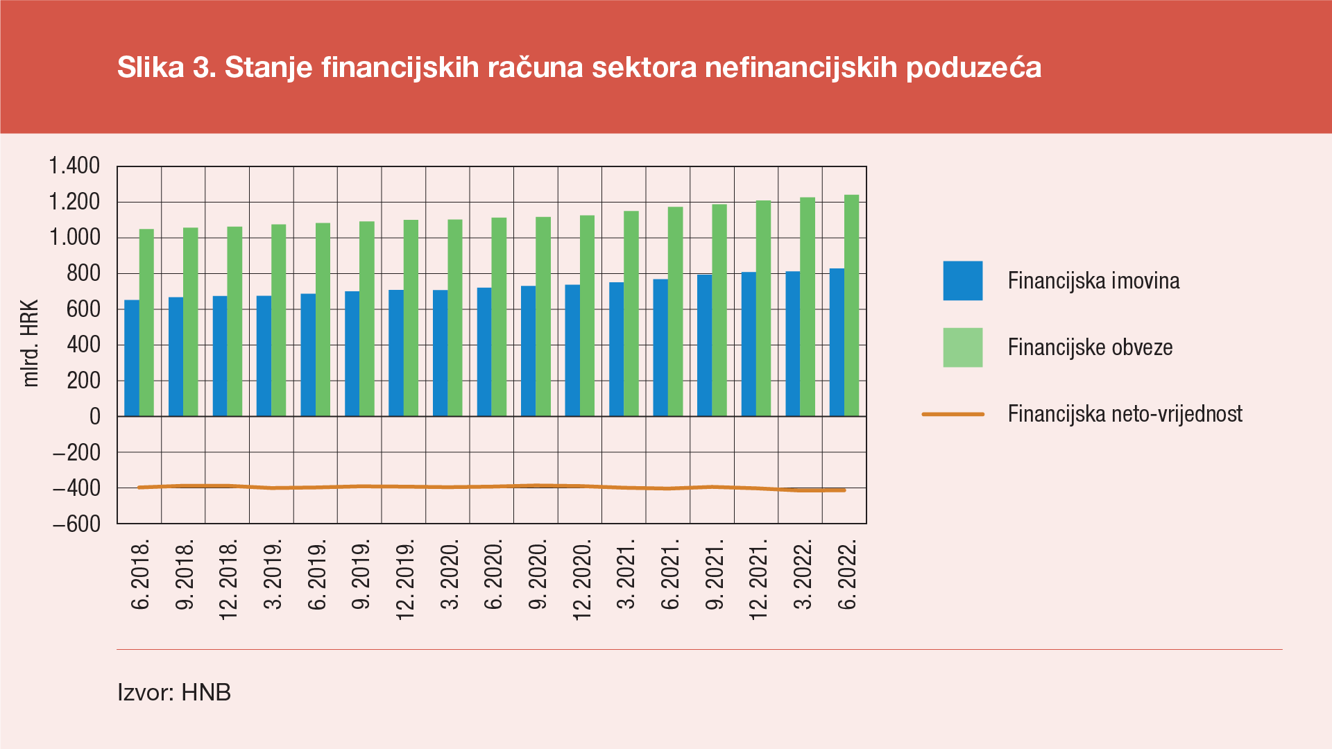 Na kraju drugog tromjesečja 2022. (Slika 3.) ukupna financijska imovina nefinancijskih poduzeća iznosila je 830 mlrd. HRK, tj. 2,0% više nego na kraju prethodnog tromjesečja. Financijske obveze nefinancijskih poduzeća iznosile su 1.242 mlrd. HRK, što je rast od 1,2% u odnosu na kraj prethodnog tromjesečja. Rezultat takvih kretanja bilo je tek drugo tromjesečno povećanje financijske netovrijednosti sektora nefinancijskih poduzeća od četvrtog tromjesečja 2020. godine u kojemu je započeo trend njezina smanjenja, te ona sada iznosi –413 mlrd. HRK, što je za 0,5% više nego na kraju prethodnog tromjesečja. Promatra li se dulji vremenski raspon, ta su kretanja obrnuta, odnosno u razdoblju od godine dana netovrijednost poduzeća smanjila se za 8,4 mlrd. HRK.