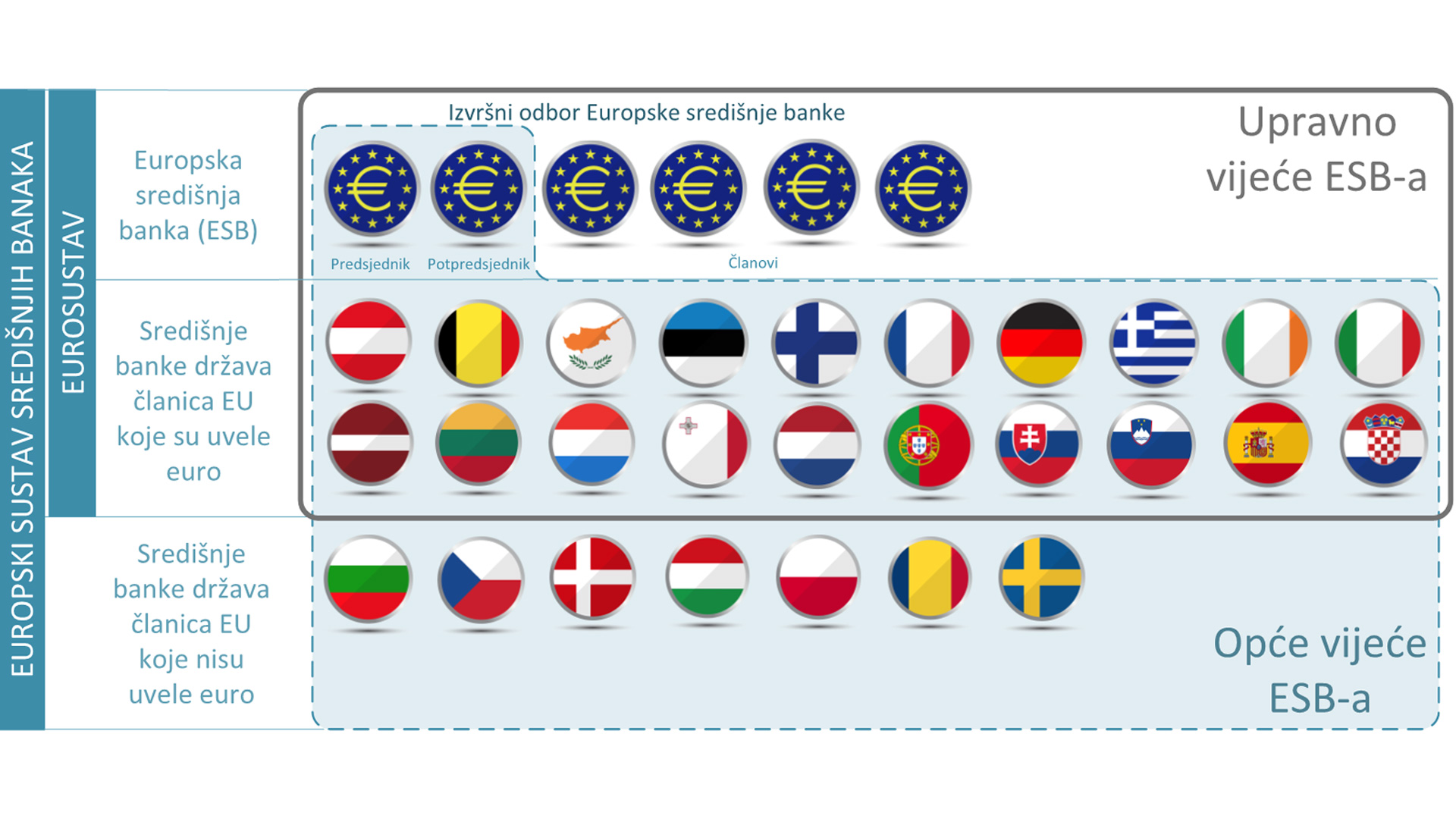 Eurosustav čine ESB i nacionalne središnje banke 20 država članica EU-a koje su uvele euro. Eurosustav i ESSB usporedno će postojati sve dok ima država članica EU-a izvan europodručja.