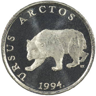 Motiv na naličju: U središnjem dijelu prikaz mrkog medvjeda u pokretu, najveće zvijeri sa staništem u Republici Hrvatskoj. Uz donji rub, u središnjem dijelu, godina kovanja. Lijevo od istaknute godine kovanja, polukružno uz rub djelomično omeđuje prikaz medvjeda natpis "MRKI MEDVJED" (lat. "URSUS ARCTOS").