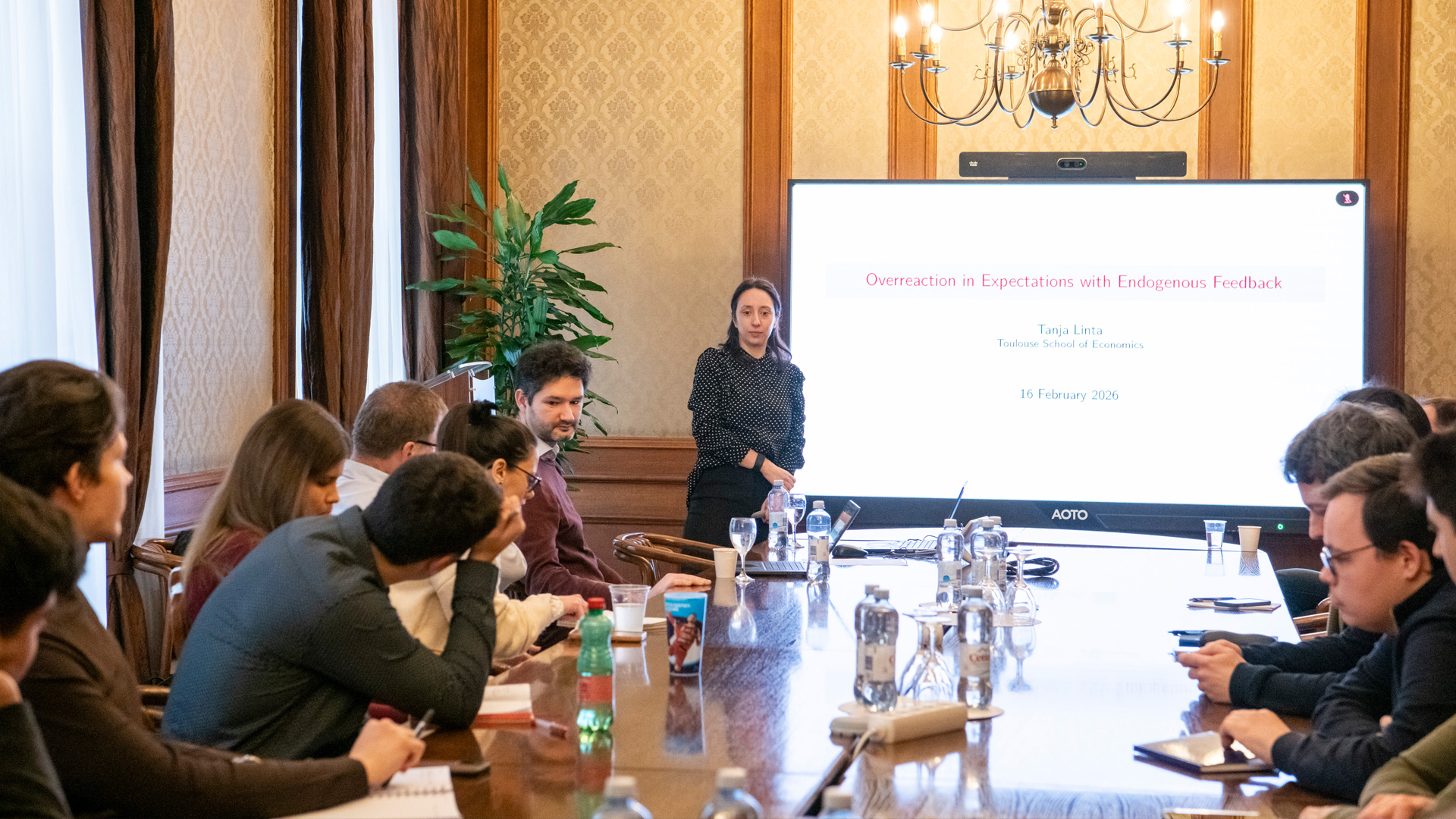 Tanja Linta (Toulouse School of Economics) predstavila je danas na 78. Ekonomskoj radionici Hrvatske narodne banke svoj rad "Pretjerana reakcija u očekivanjima s endogenim povratnim informacijama". Ovaj rad mjeri pristranosti u očekivanjima unutar okruženja karakteriziranih povratnim petljama između očekivanja i ishoda. Kroz eksperiment predviđanja, autorica pruža dokaze da, iako pojedinci sustavno pretjerano reagiraju na nedavne informacije, ta je pretjerana reakcija ublažena stabilizirajućim povratnim mehanizmima opće ravnoteže. Jednostavan teorijski model koji uključuje skupu obradu informacija pokazuje da je takvo ublažavanje moguće samo ako agenti prepoznaju postojanje povratne veze i u skladu s tim prilagode svoje ponašanje, čime se pojačavaju njezini stabilizirajući učinci. Unutar okvira novokejnzijanskog pristupa, jača stabilizirajuća povratna veza koja ublažava pristranost predviđanja ubrzava konvergenciju endogenih varijabli prema ravnoteži racionalnih očekivanja.