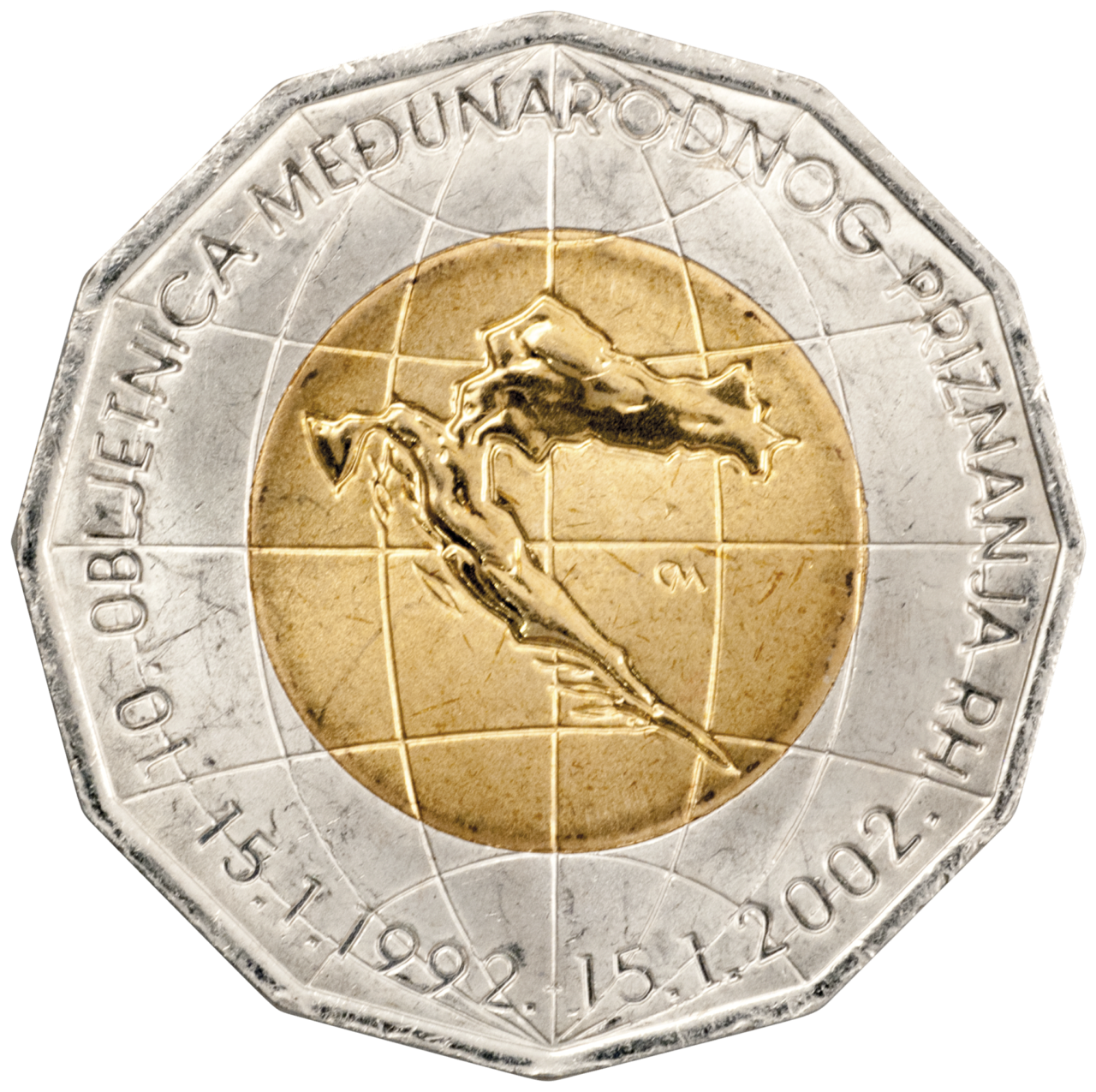 Motif on the obverse: the central part of the coin core shows the relief of the Republic of Croatia, crossed by slightly curved horizontal and vertical lines, symbolizing parallels and meridians of the planet Earth. This image represents the Republic of Croatia as an independent state on the globe. Two dates: "15. 1. 1992. - 15. 1. 2002." are positioned centrally along the lower edge. They are followed by the inscription "10. OBLJETNICA MEĐUNARODNOG PRIZNANJA RH", which stretches from the left to the right, closing the circle on the coin.