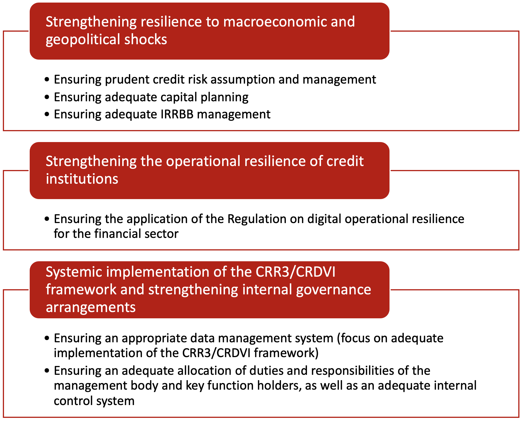 In accordance with the division of competences, supervisory priorities for the supervision of SIs are defined by the ECB, while the CNB is responsible for defining priorities for the supervision of LSIs. When defining supervisory priorities for LSIs, the CNB has been guided by the assessment of vulnerabilities and threats to credit institutions, which largely also reflects the priorities of the ECB and the European Banking Authority (EBA).