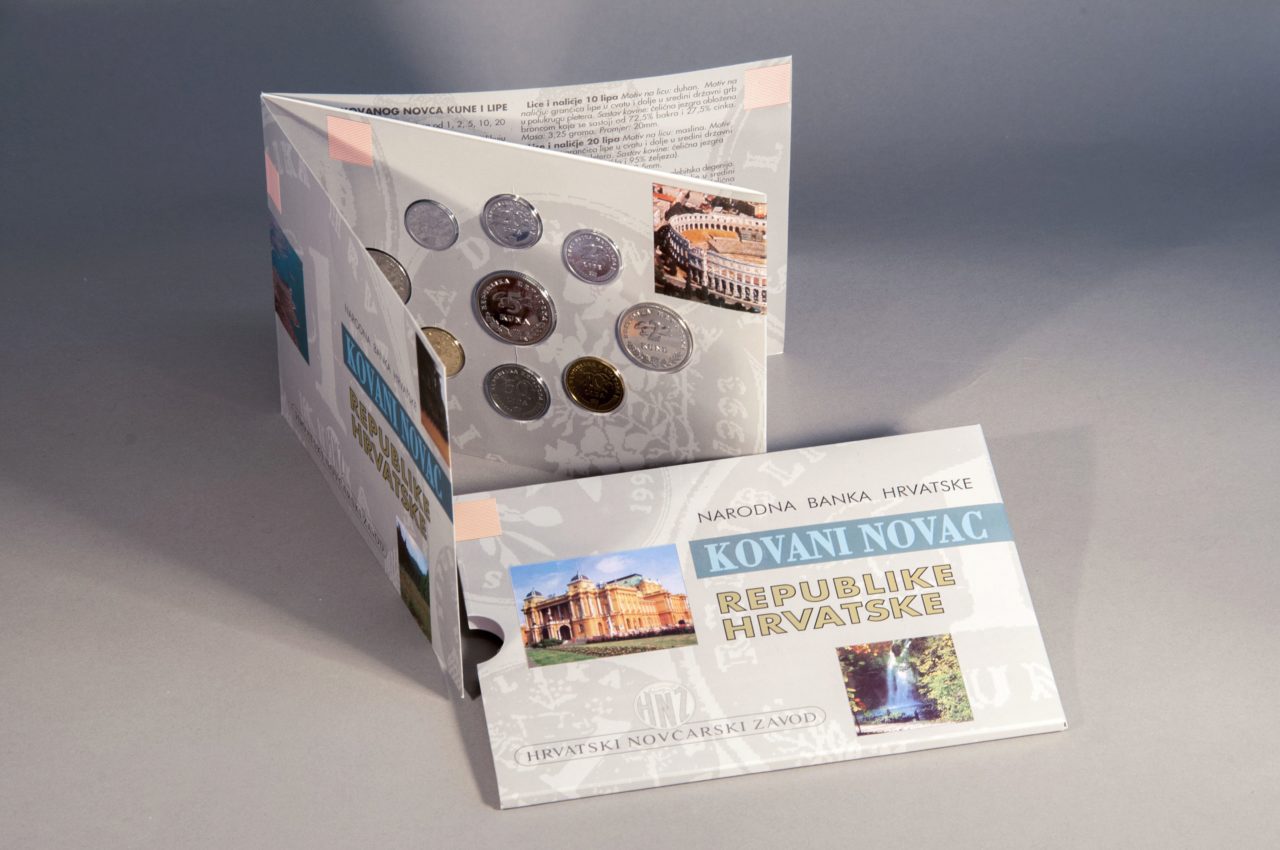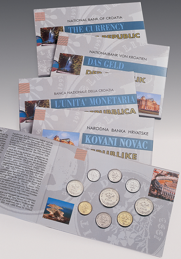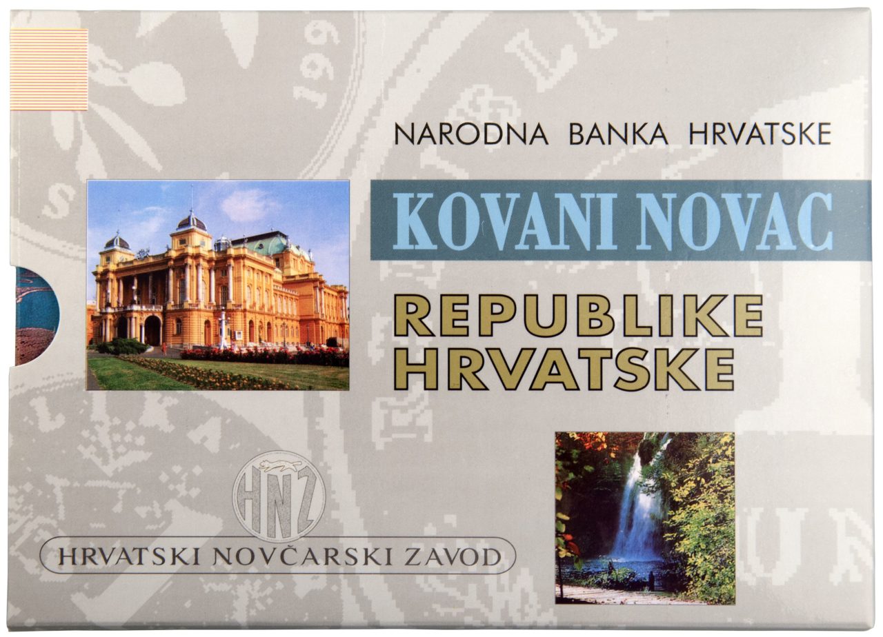 In order to promote the Republic of Croatia and its monetary unit, the Croatian National Bank issued a set of circulation coins bearing inscriptions in four languages: Croatian, German, English and Italian. The coin set is sealed into a transparent plastic sheet, mounted in a suitable cover. Printed on the cover is an article on the Republic of Croatia and the basic features of the coins, accompanied by the photographs of cities, important monuments and natural beauties of the Republic of Croatia.