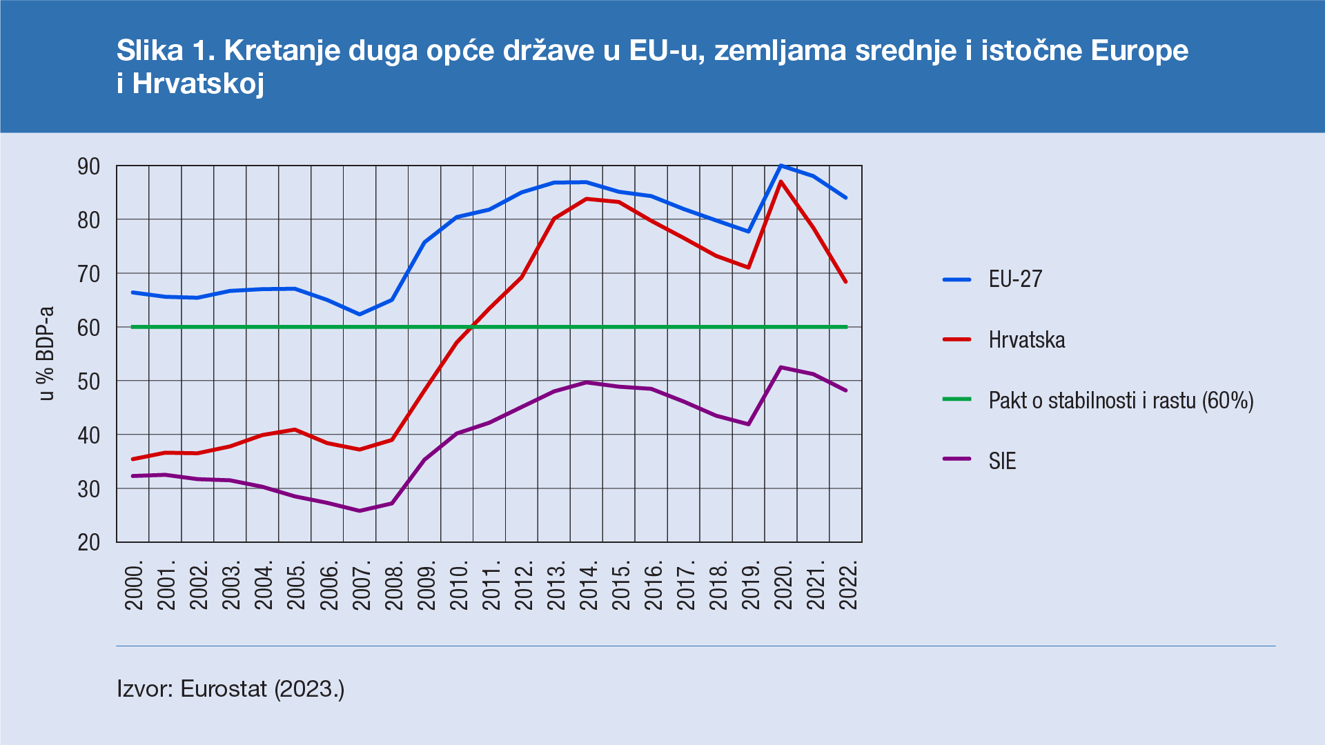 Slika 1. Kretanje duga opće države u EU-u, zemljama srednje i istočne Europe i Hrvatskoj