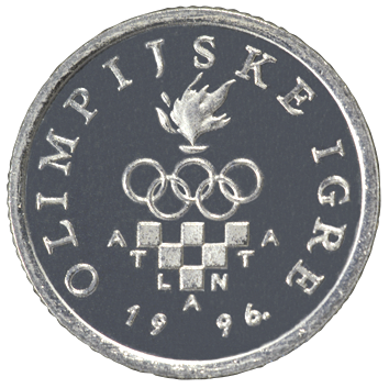 Motiv na naličju: U središnjem djelu prikaz je znaka Hrvatskog olimpijskog odbora s pet olimpijskih krugova ispod kojih je u tri retka postavljeno šest reljefnih, mat, kvadrata i tri ravna, sjajna, kvadrata. Iznad znaka Hrvatskog olimpijskog odbora položena je posuda iz koje plamti stilizirani olimpijski plamen, a ispod znaka, prateći stepenasti rub kvadrata ispisan je tekst "ATLANTA". Kružno, uz rub, ispisan je tekst "OLIMPIJSKE IGRE". U središnjem djelu donjeg polukruga, uz rub, ispisana je godina "1996."